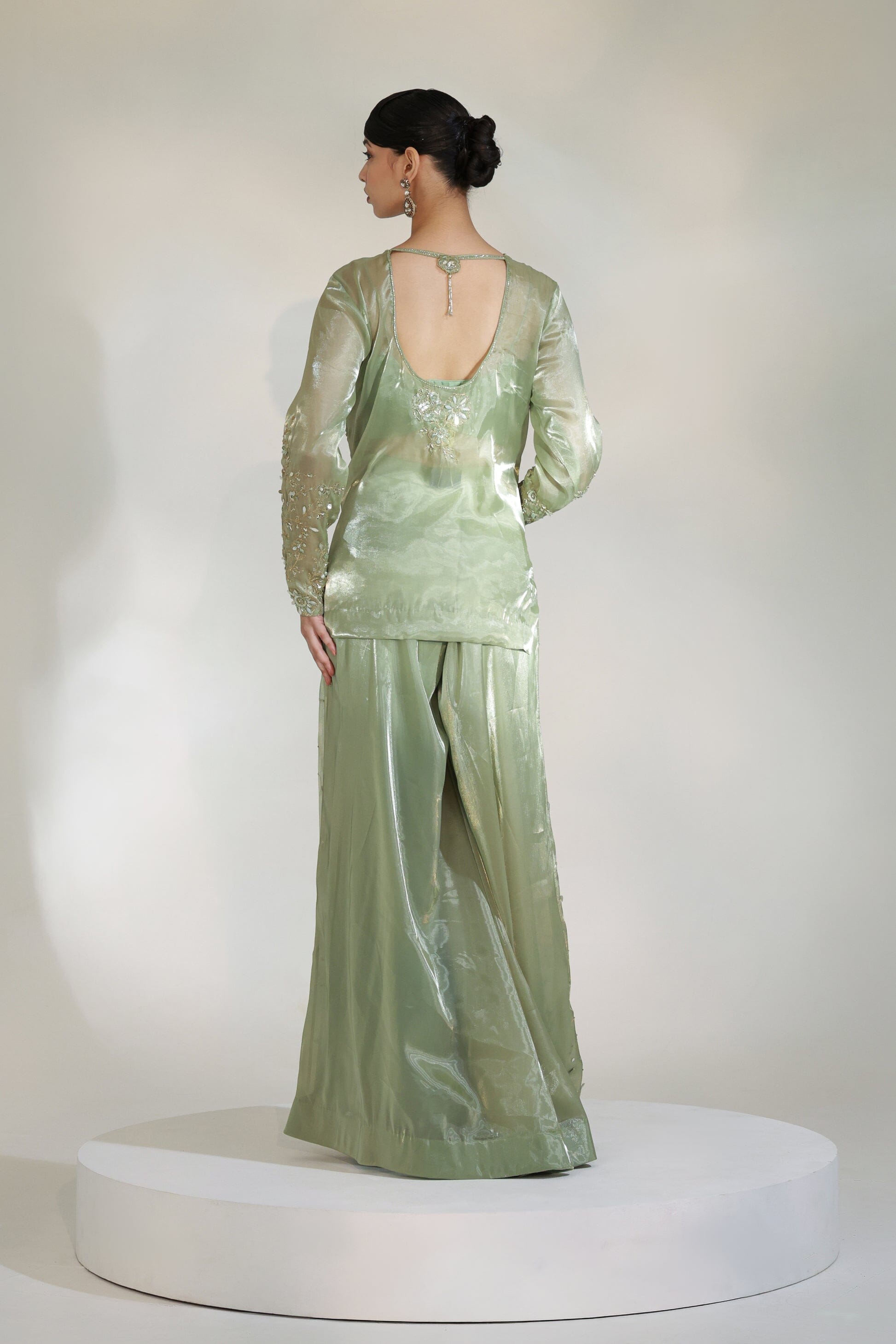 A modern festive statement with a timeless soul. This organza kurti is exquisitely hand-embroidered with zari and 3D sequins, paired with a beautifully coordinated sharara featuring the same intricate work. The dupatta is elevated with an applique-embroidered neckline design, draping like an ornament for an effortlessly regal finish.