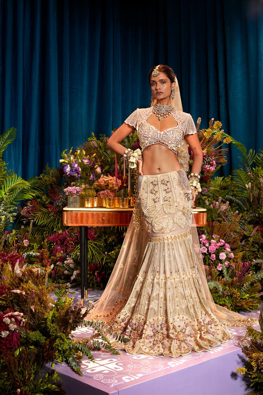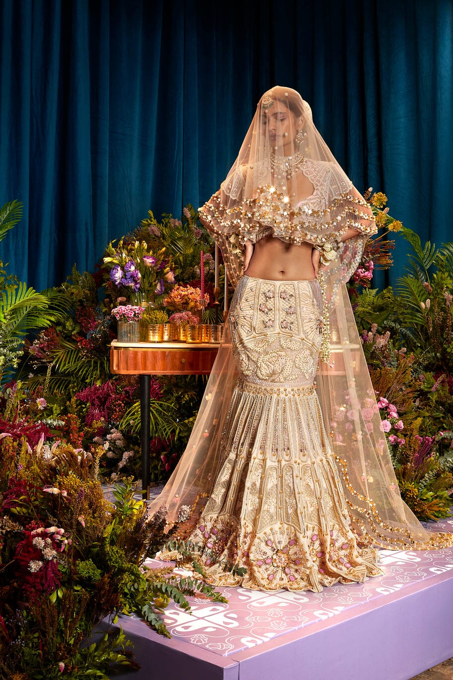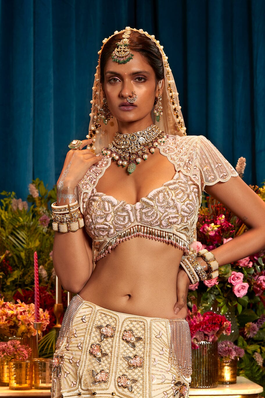 "Unveil Eternal Elegance - Our All Ivory Bridal Lehenga Set is a vision of grace and allure. Soft pink crystals and shimmering gold metals create a celestial beauty. Our signature ivory blouse with tassels adds a modern touch, while a soft ivory tulle head veil completes the enchantment. Step into the spotlight with this captivating ensemble, making your special day truly unforgettable."
