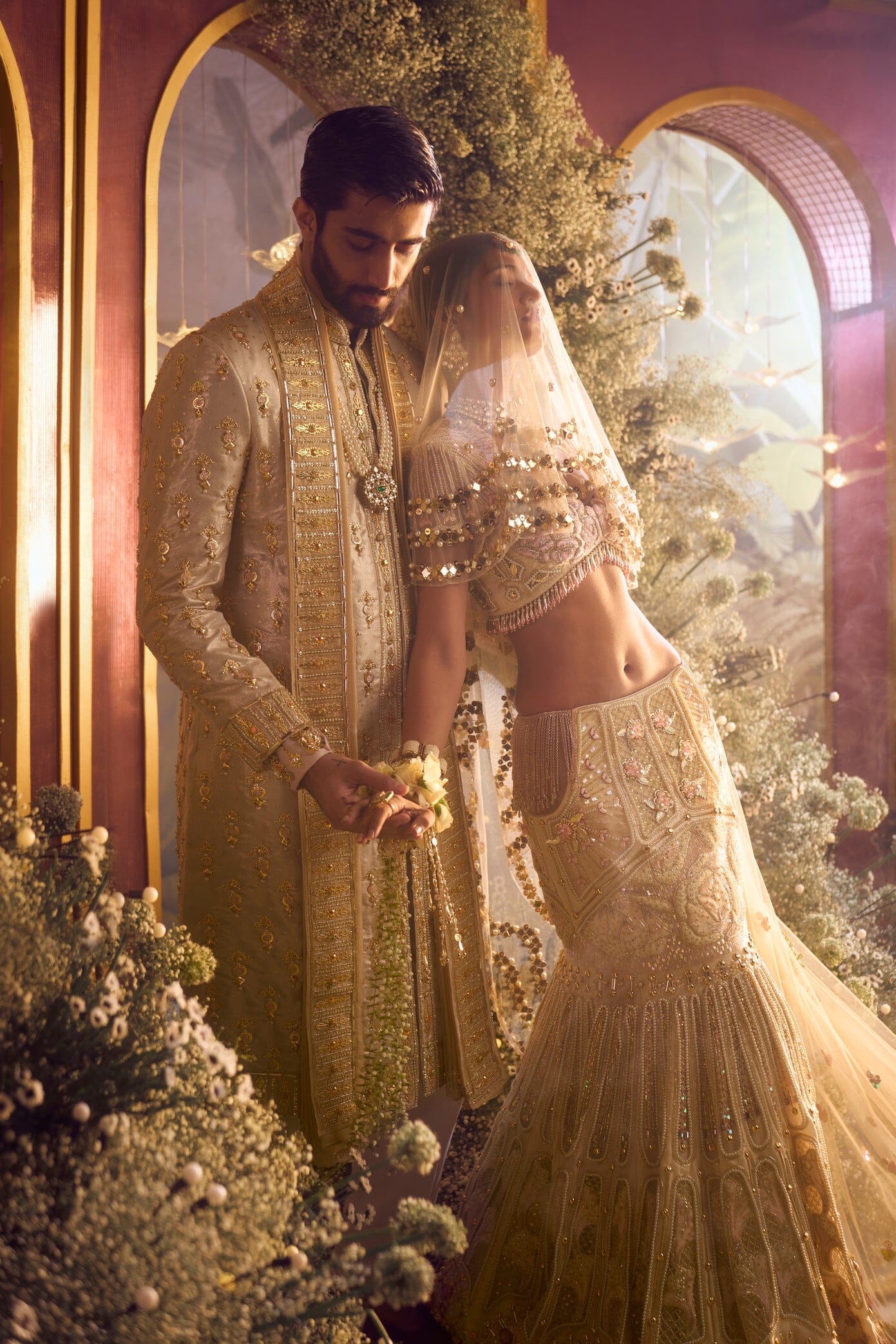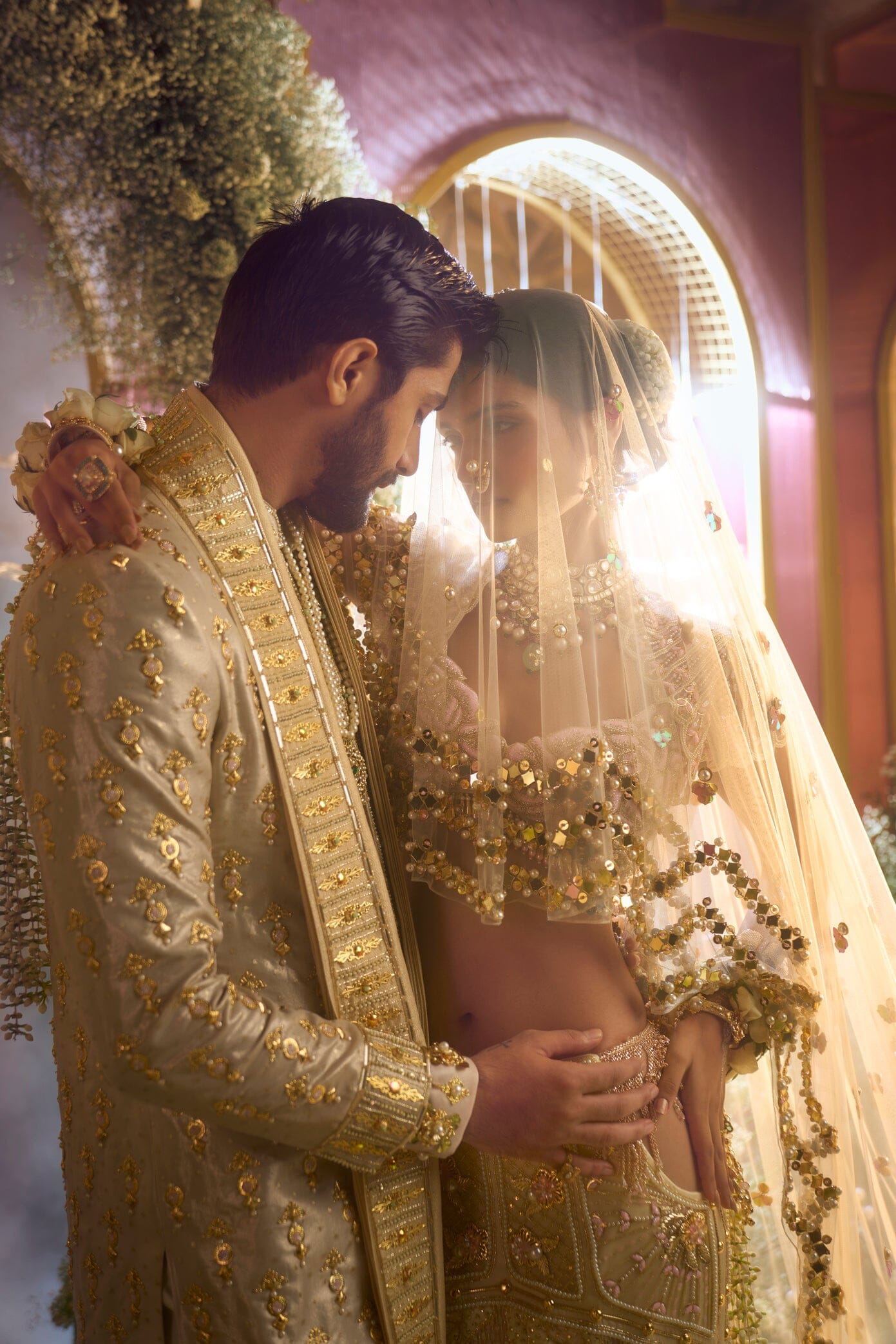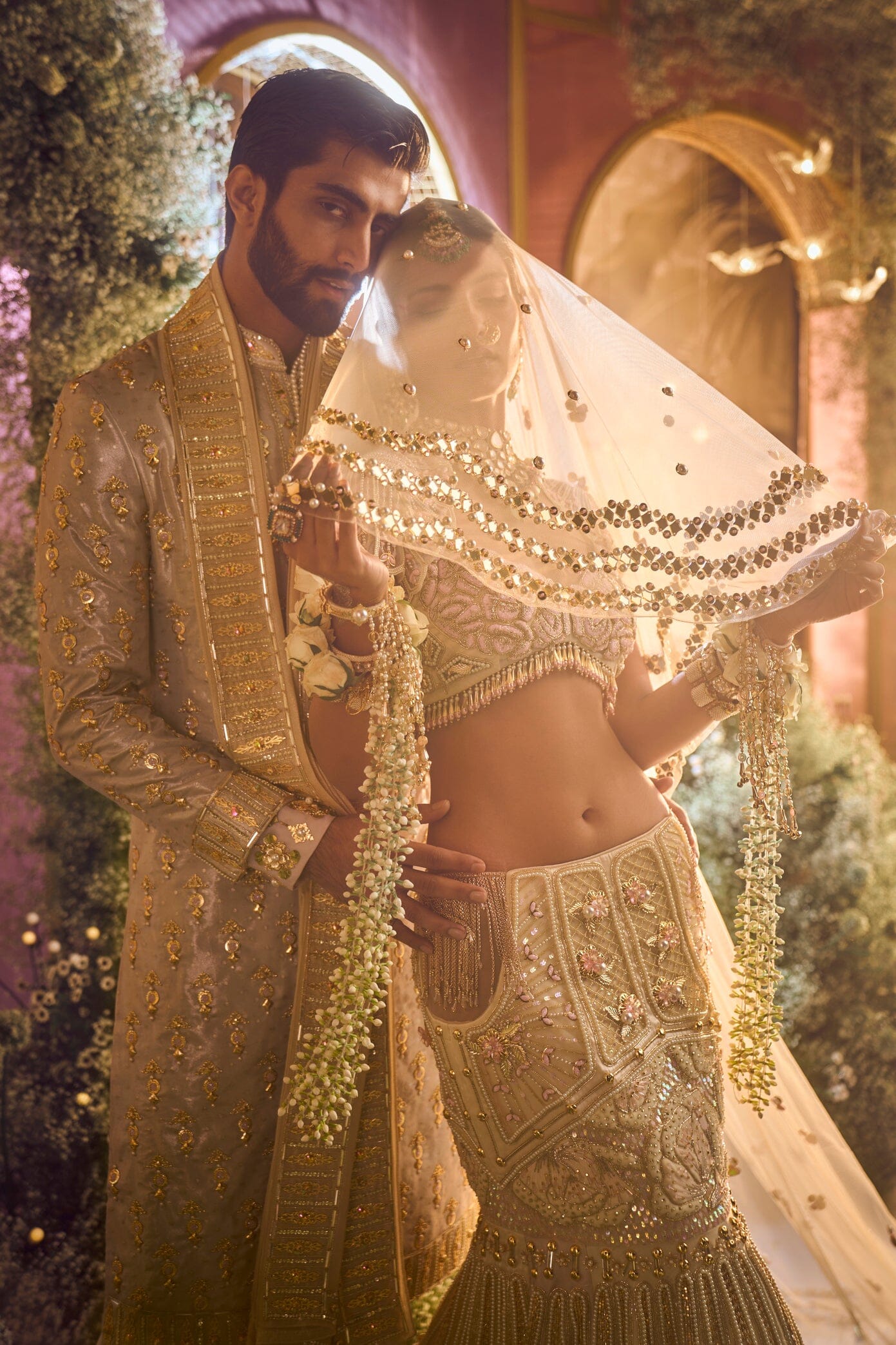 "Unveil Eternal Elegance - Our All Ivory Bridal Lehenga Set is a vision of grace and allure. Soft pink crystals and shimmering gold metals create a celestial beauty. Our signature ivory blouse with tassels adds a modern touch, while a soft ivory tulle head veil completes the enchantment. Step into the spotlight with this captivating ensemble, making your special day truly unforgettable."