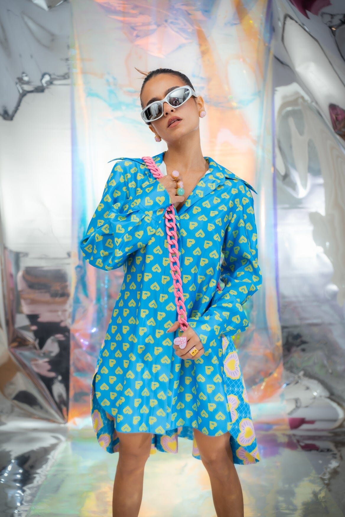 A high low silhouette satin shirt dress with contrast prints- Pac street girl and Blinding heart prints in cerulean blue. The look is completed with a regular collar and an exaggerated collar layered on, to form a double collar embellished with our signature lilac enamelled bandaids.