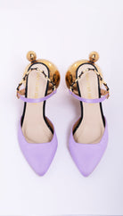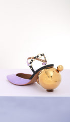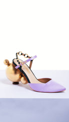 With spot-light worthy engineered Atomic heels in an all gold , this pointy-toe shoe is hand-crafted in a soft lilac satin, featuring a slick square cut at the toes.