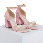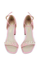 Wholly hand-embellished pair of heels, delicately laden with pearls, is handcrafted in a soft blush satin. She’s embroidered, inspired by the concept of wishing upon a dandelion in pop colours and glass beads, that take to the wind and spread out as pearly puffballs. The D'orsay counter cups the ankle and she’s finished with an elegant open toe strap.
