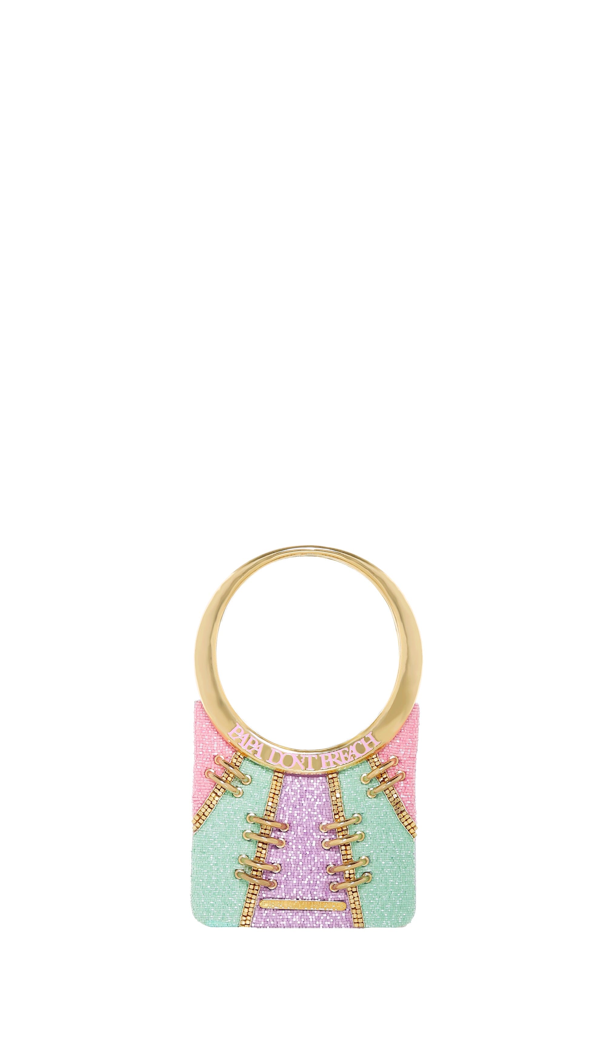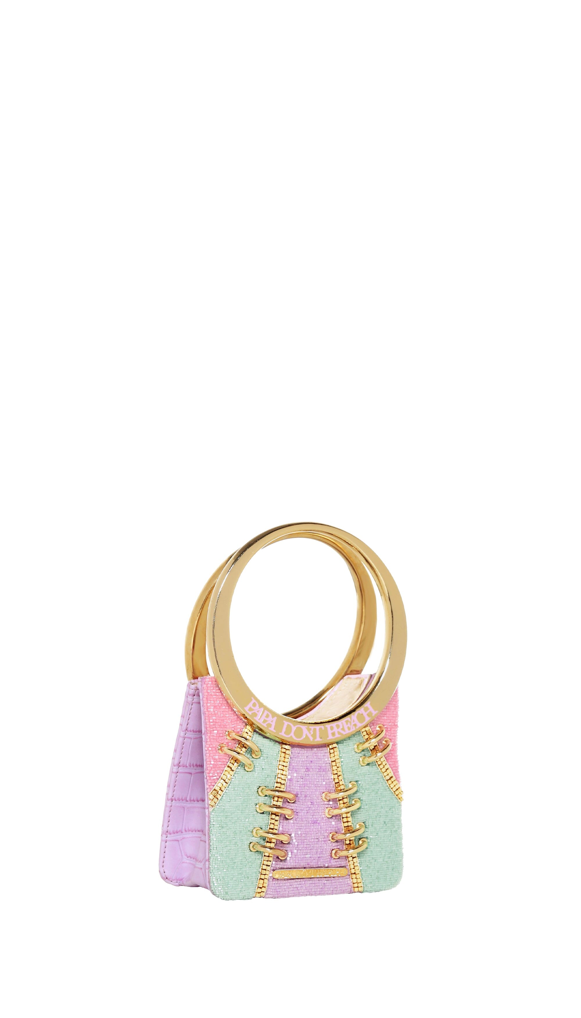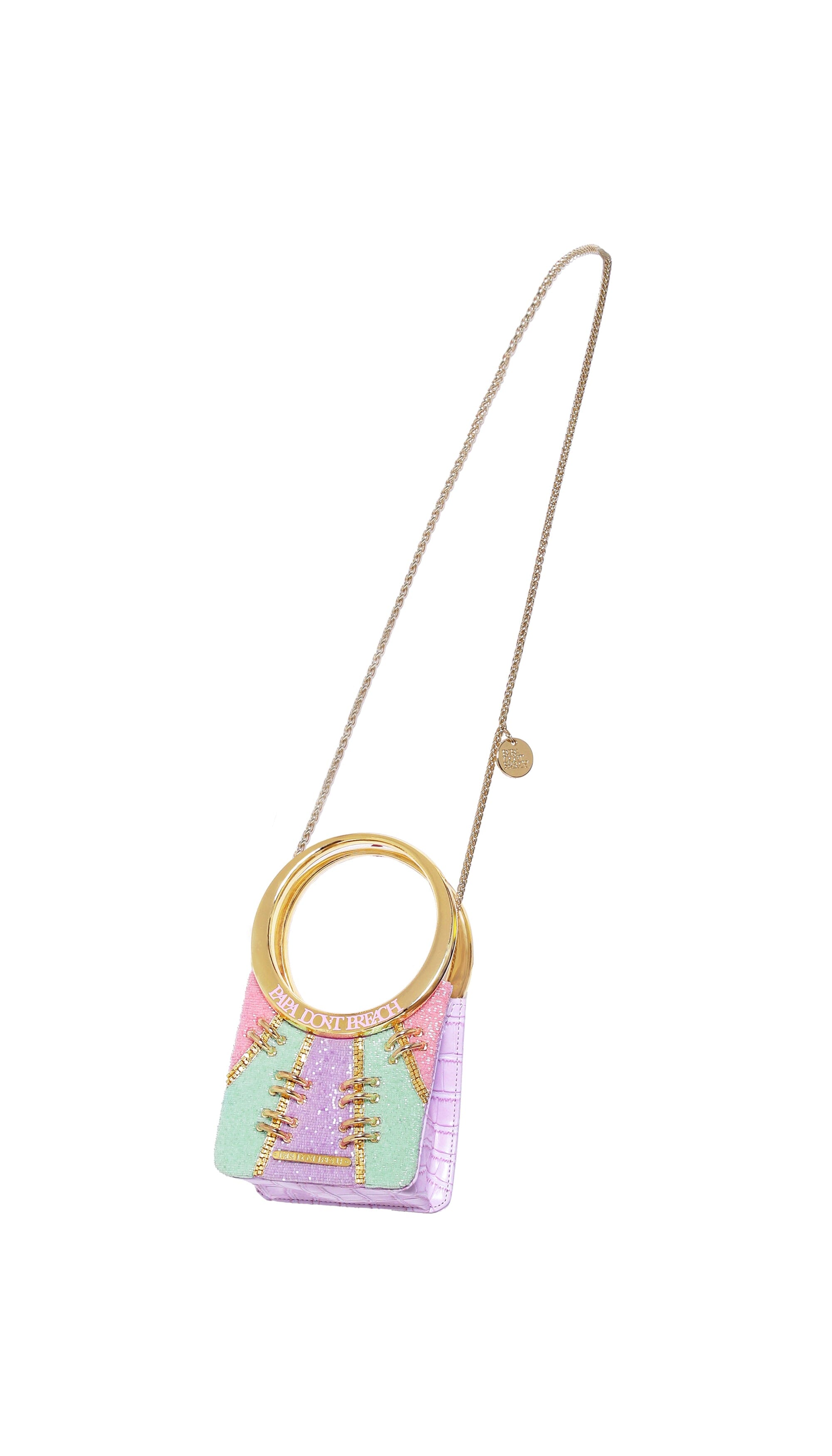 FitzACat 0 is our XXXS Bag hand embroidered in Lilac, Mint and Pink radial panels. Accentuated with metal trims and our signature metal enameled Spidey handle. Comes with a chain-link strap.