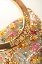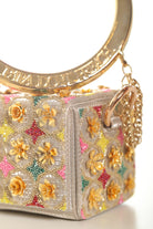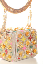 A Gold faux leather mini cube shaped bag embroidered all over with contrasting coloured glass cut beads and metal flowers. Attached with chains is our signature metal Spidey handle.