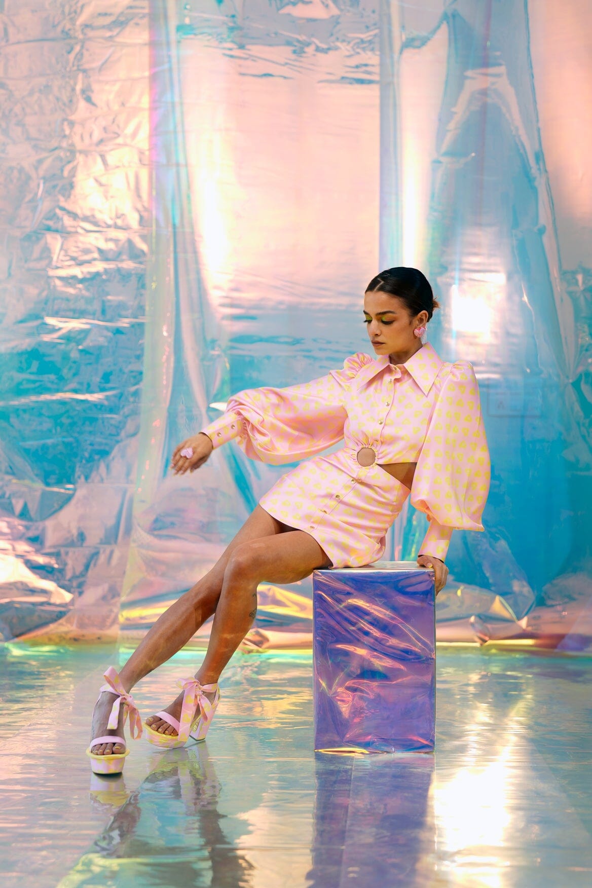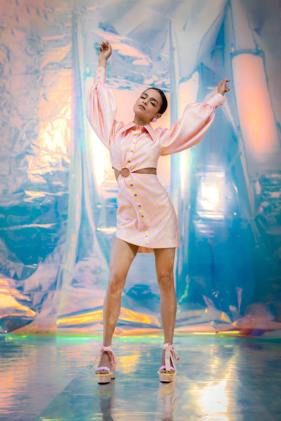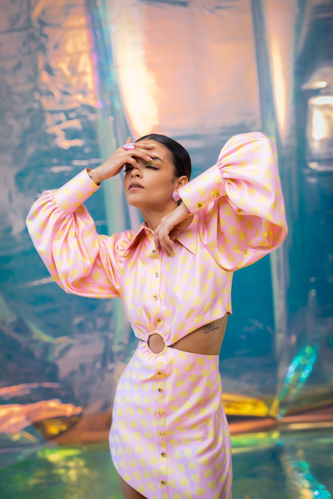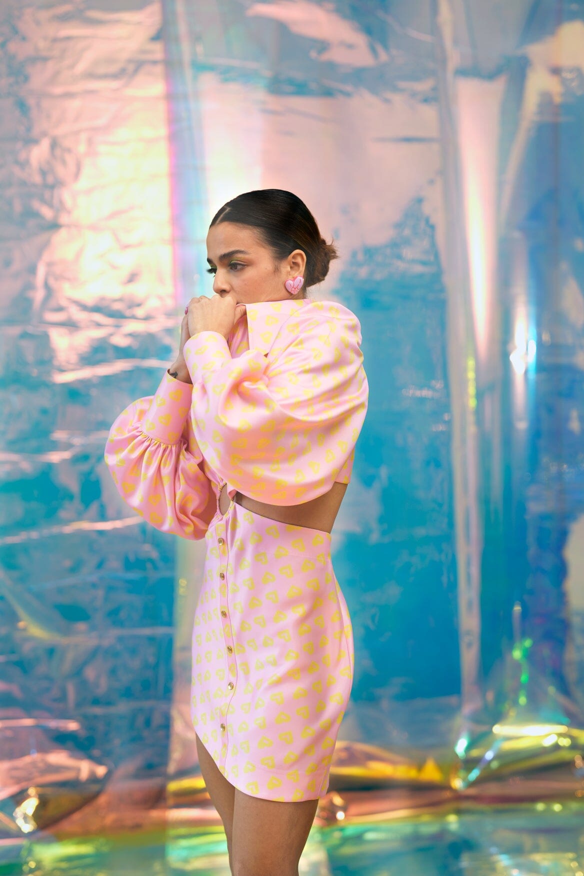 A satin dress in our pink Pac street girl print with waist ring and cut out detailing. Puff sleeves, a thicker cuff and an exaggerated collar complete this dress.