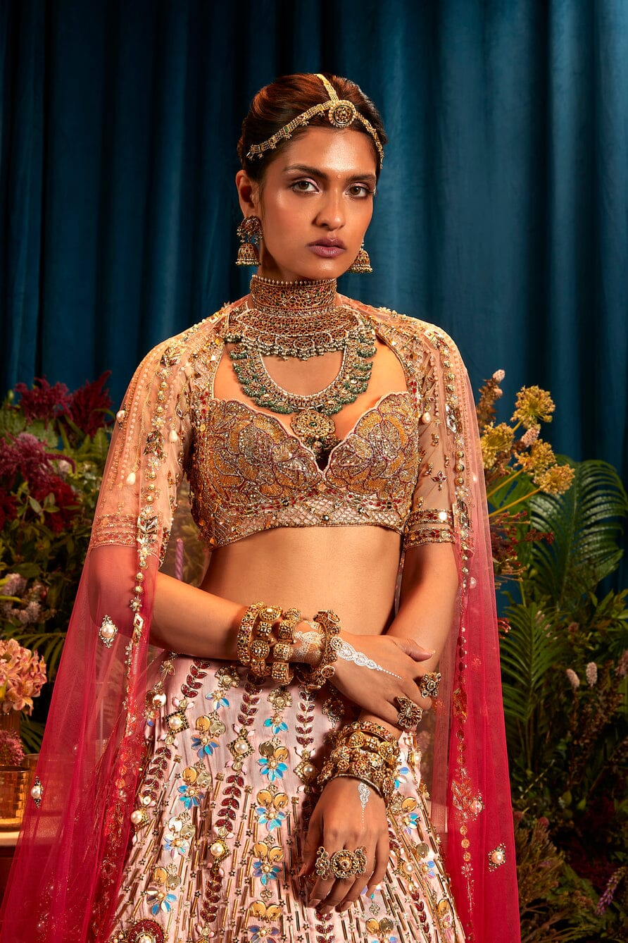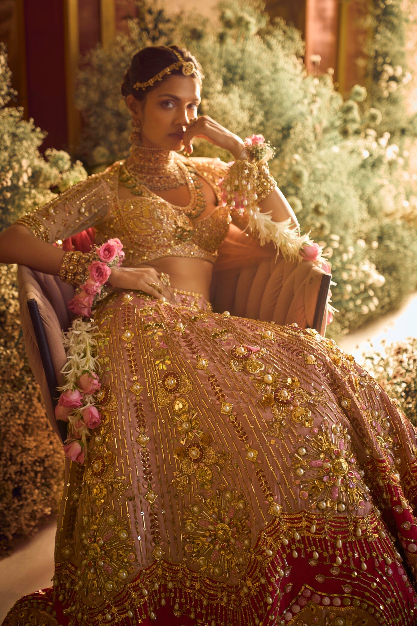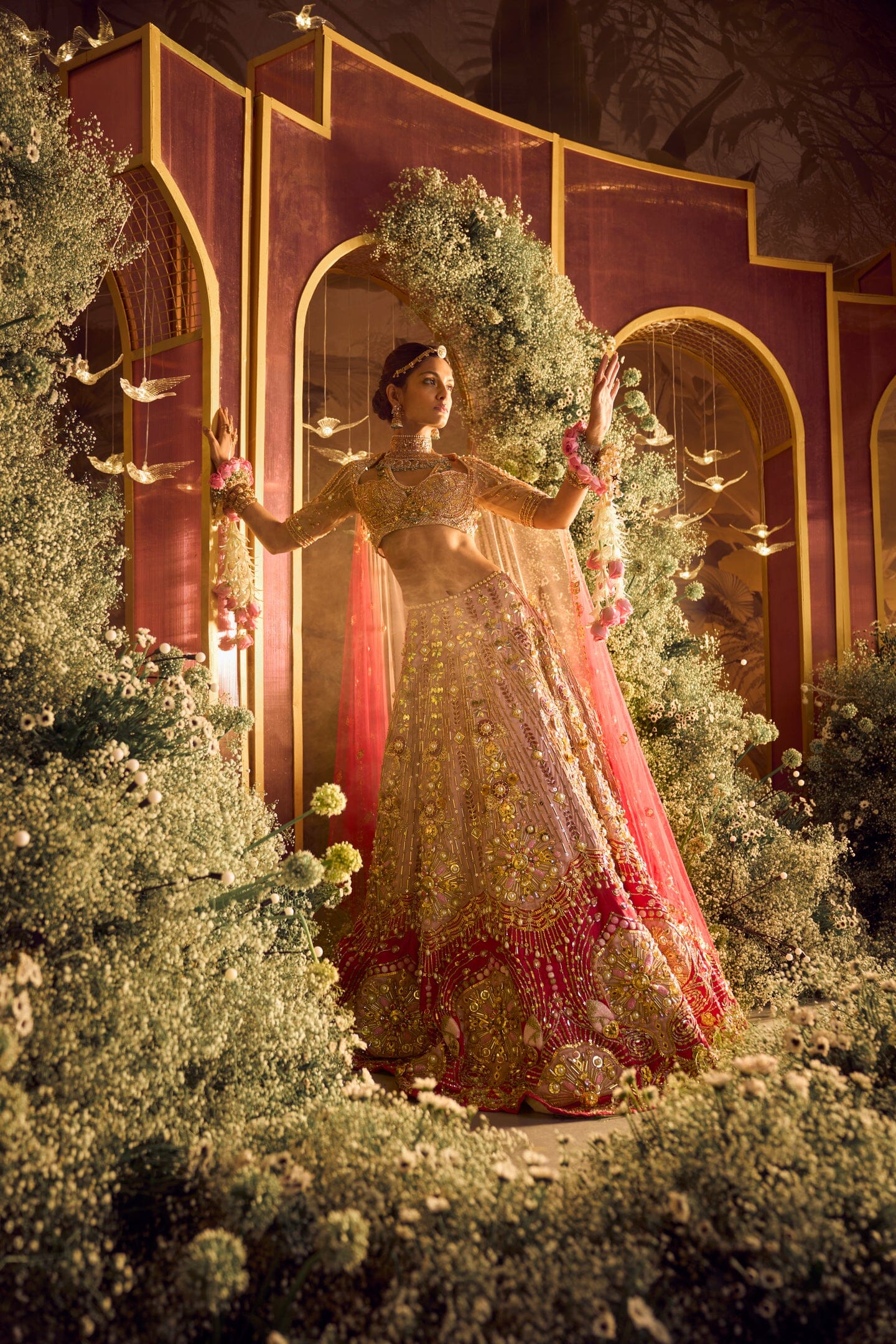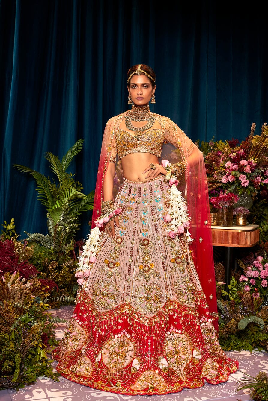 A 3 piece bridal lehenga set in pEACH & red raw silk embroidered with gold metal embellishments, pearls, glass cut beads, and precious stones. Paired with a Papa Don’t Preach rose half sleeved blouse embroidered with glass cut beads and gold metal embellishments. This look is completed with a shaded tulle red and pink dupatta. A 3 piece bridal lehenga set in pink & red raw silk embroidered with gold metal embellishments, pearls, glass cut beads, and precious stones. Paired with a Papa Don’t Preach rose half sleeved blouse embroidered with glass cut beads and gold metal embellishments. This look is completed with a pre-draped red tulle scalloped dupatta embroidered with gold metal embellishments.