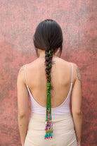 A bunch of multicolor ceramic beads tied together with threads and wool to create a beautiful parandi for the boho in you.