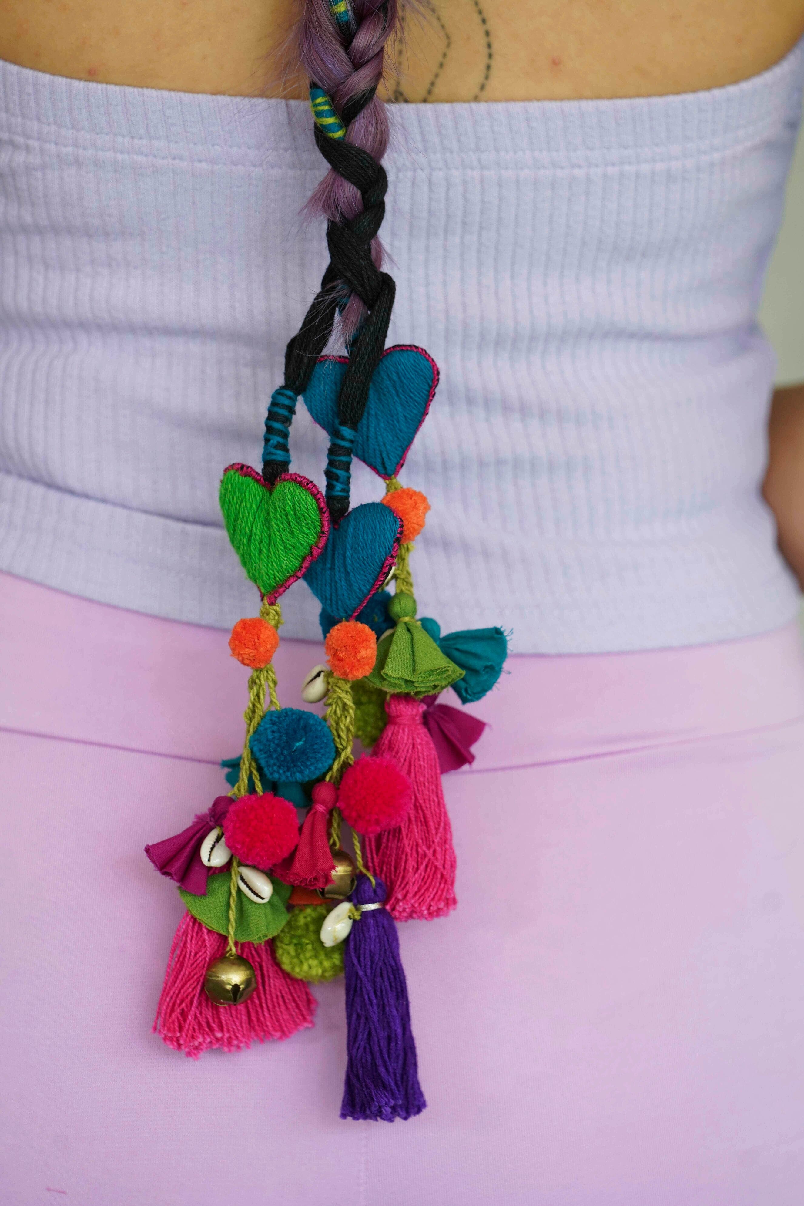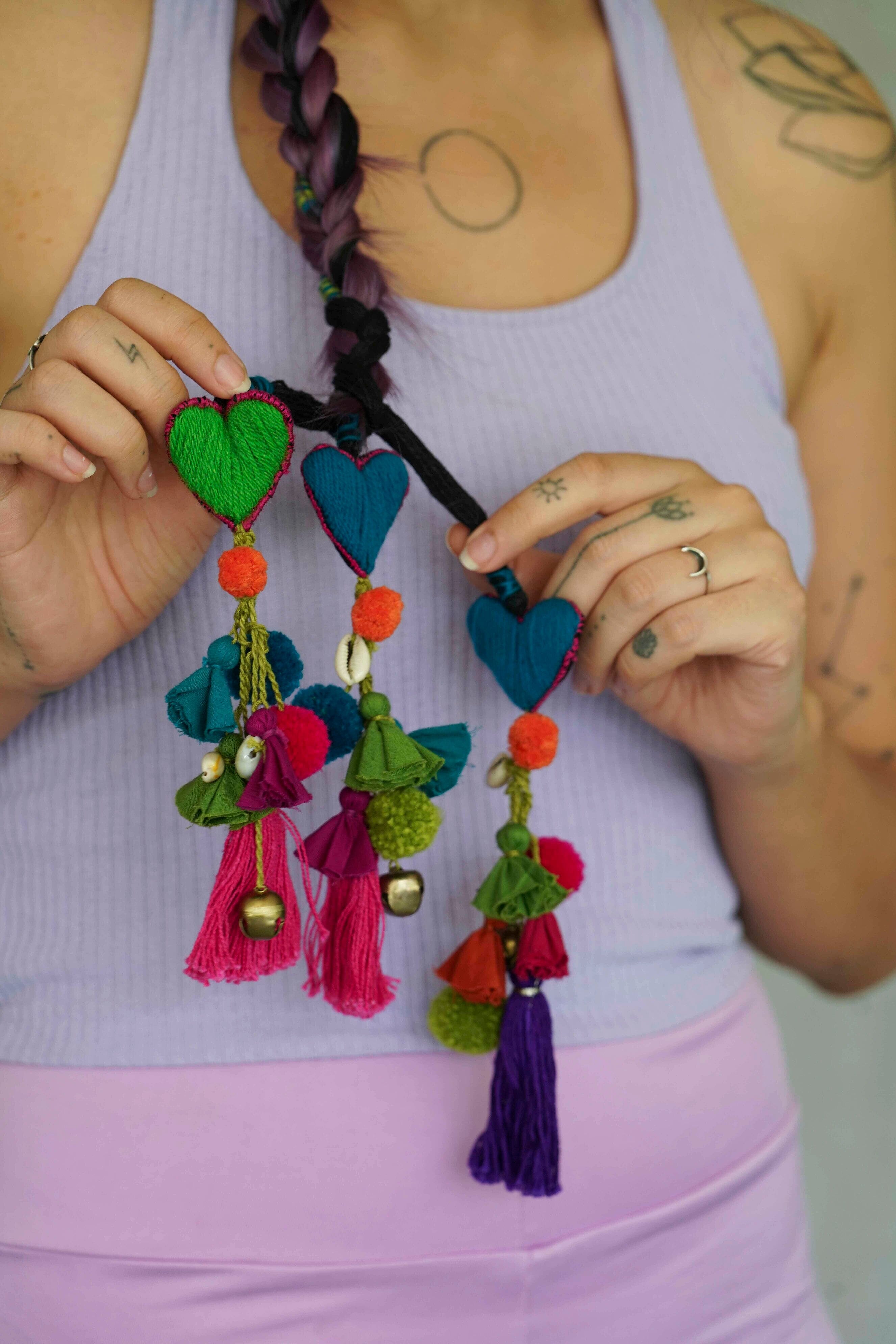 Montón de coloridos corazones, borlas, ghungroos y cauríes bordados a mano. Hecho a mano con mucho amor por nuestros artesanos de patwa para el boho que llevas dentro.
