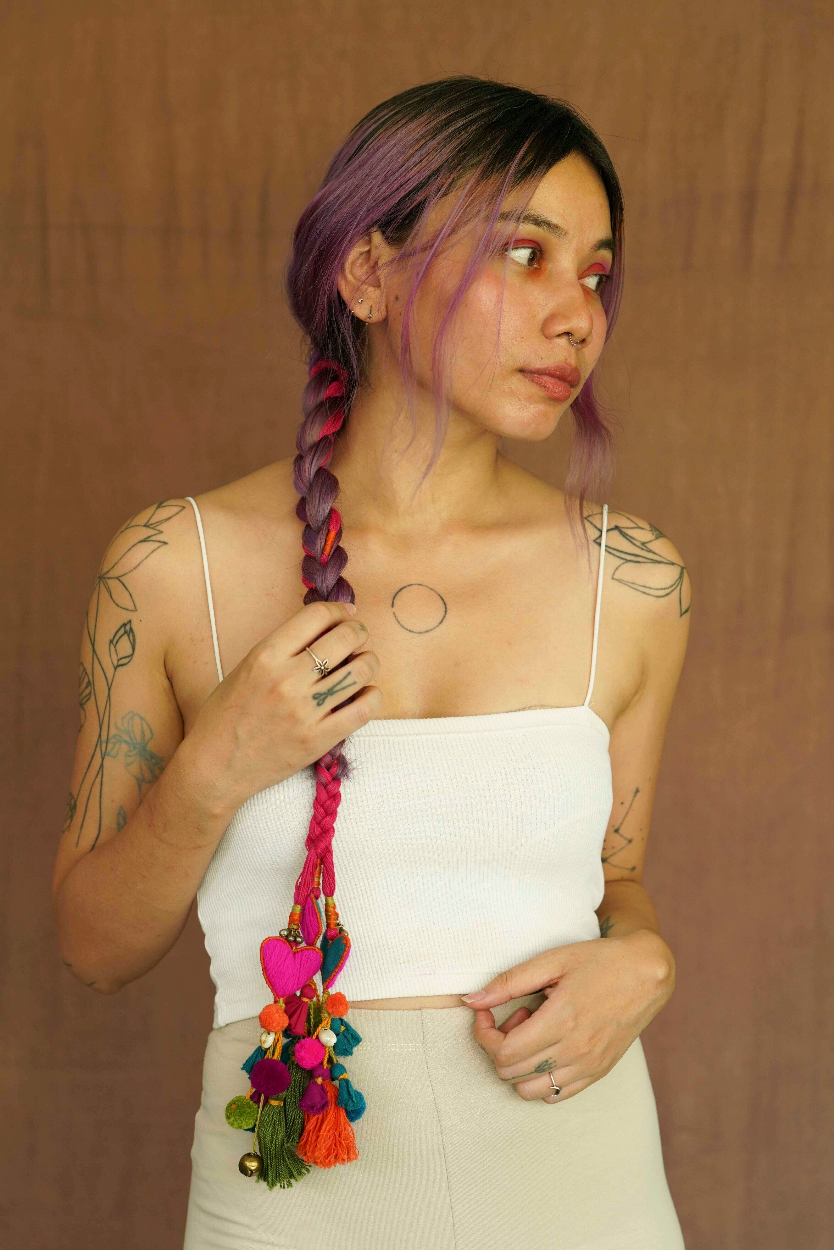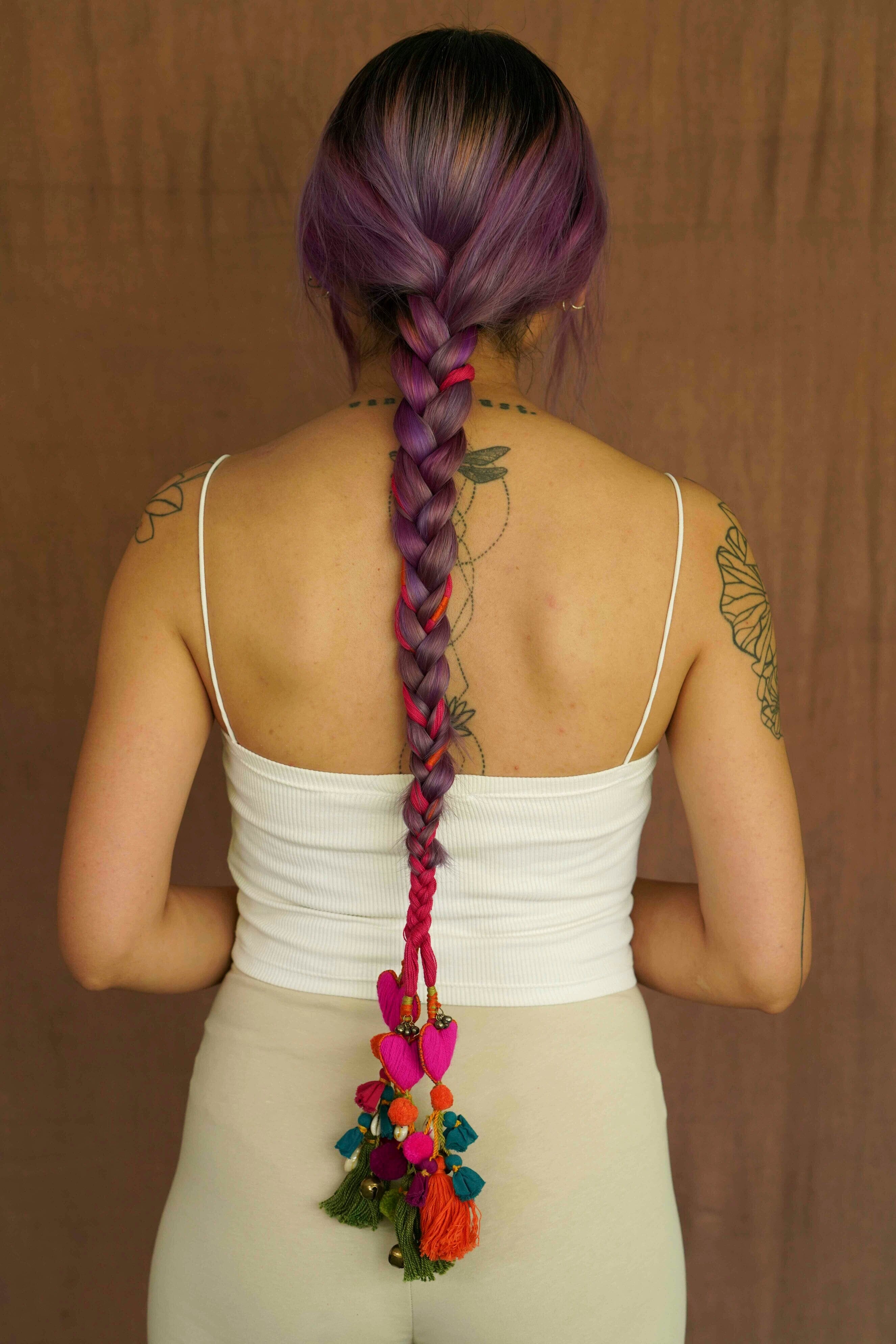 Montón de coloridos corazones, borlas, ghungroos y cauríes bordados a mano. Hecho a mano con mucho amor por nuestros artesanos de patwa para el boho que llevas dentro.