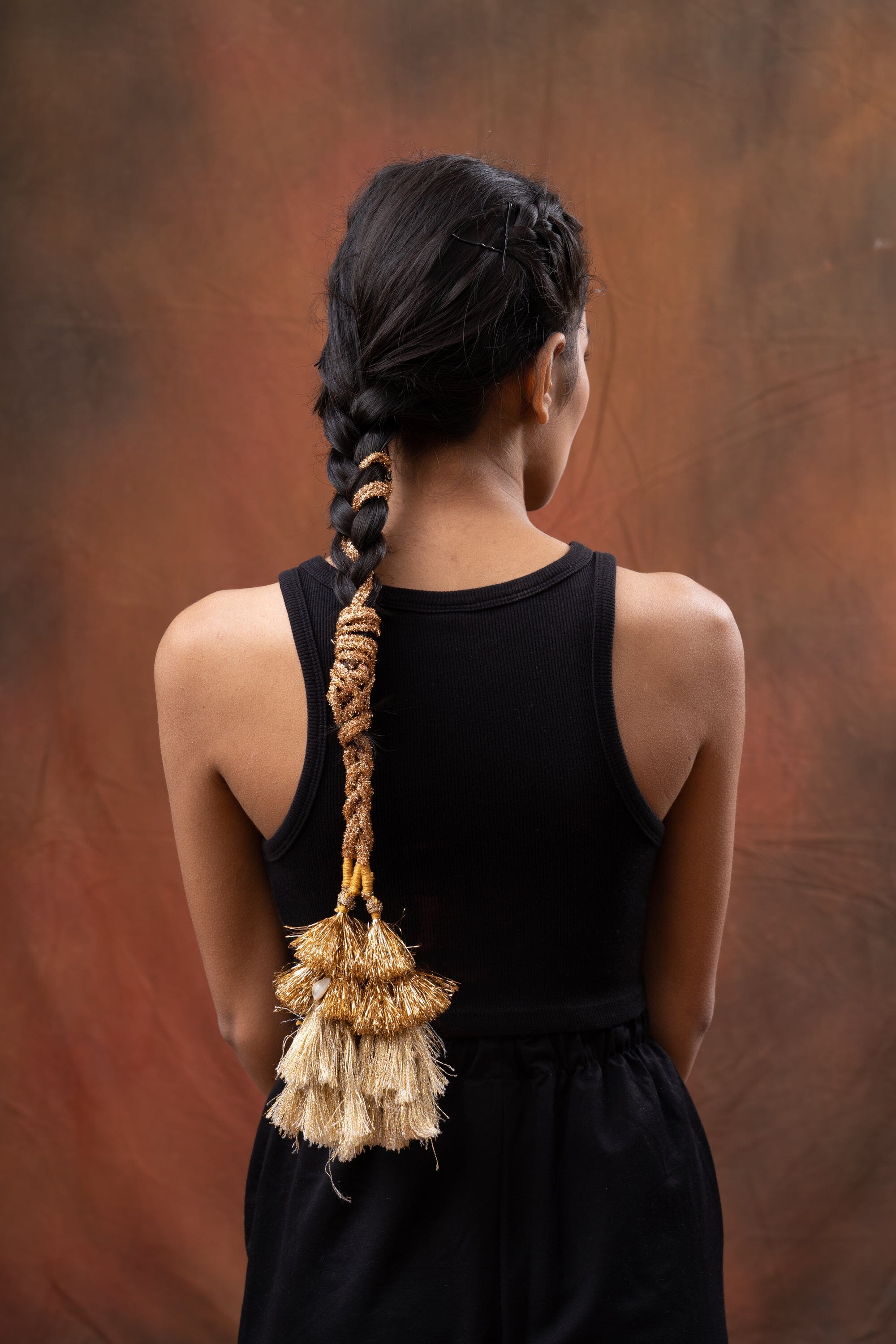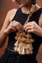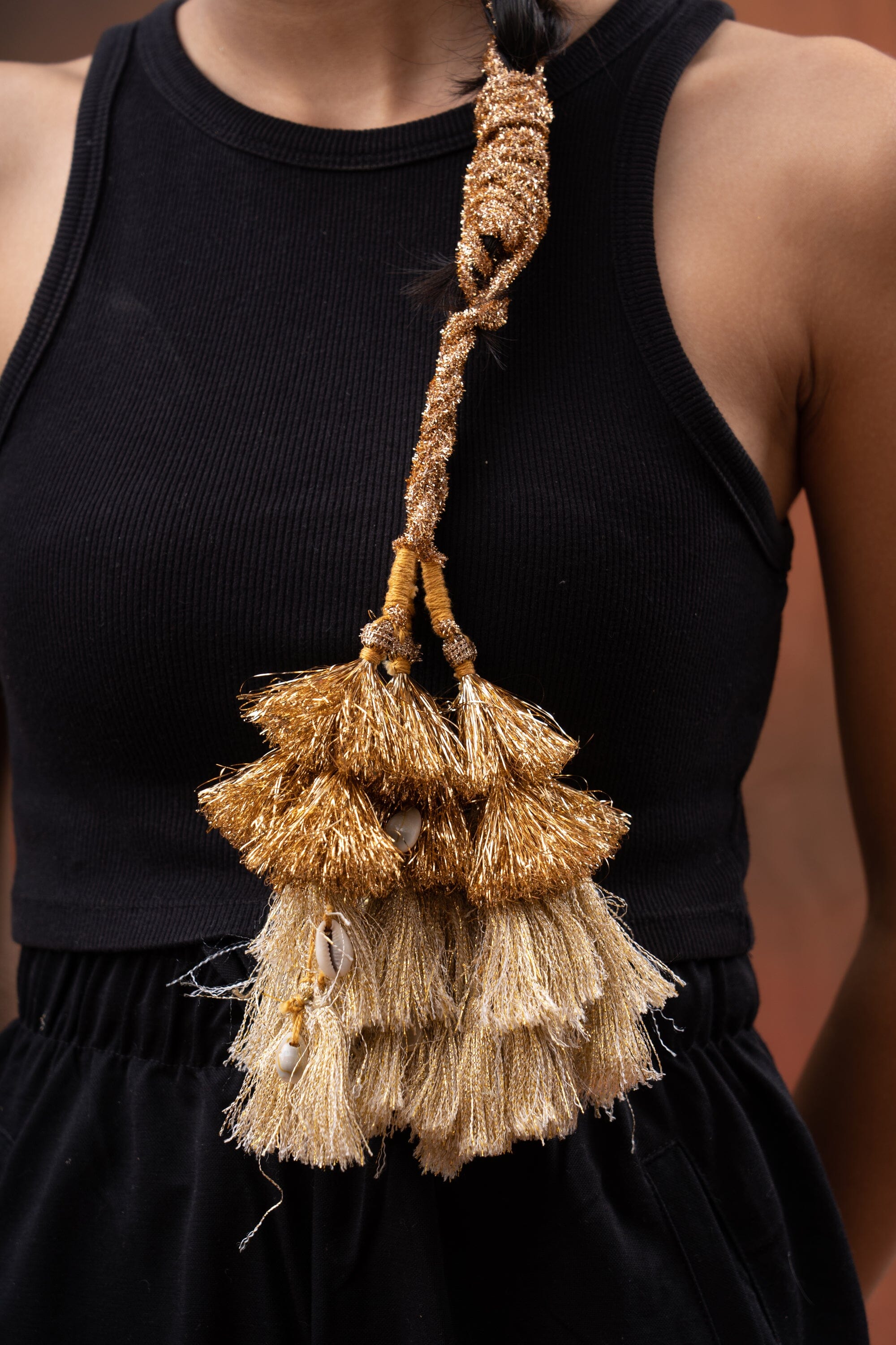 Un montón de borlas doradas y beige unidas en un hermoso parandi