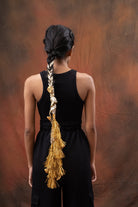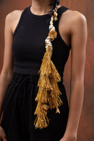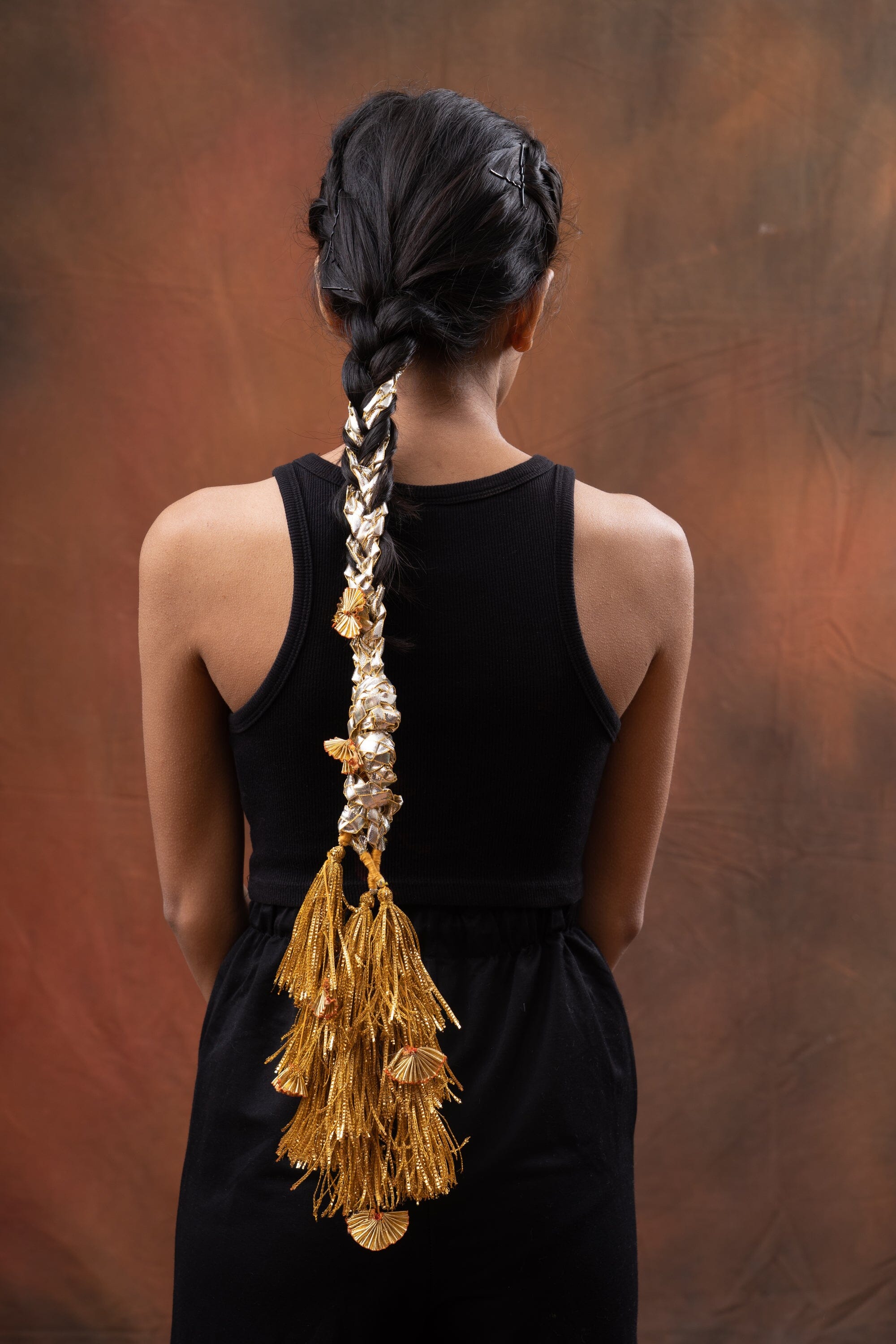 Hilos de zari dorados atados en borlas crean un hermoso y llamativo parandi.