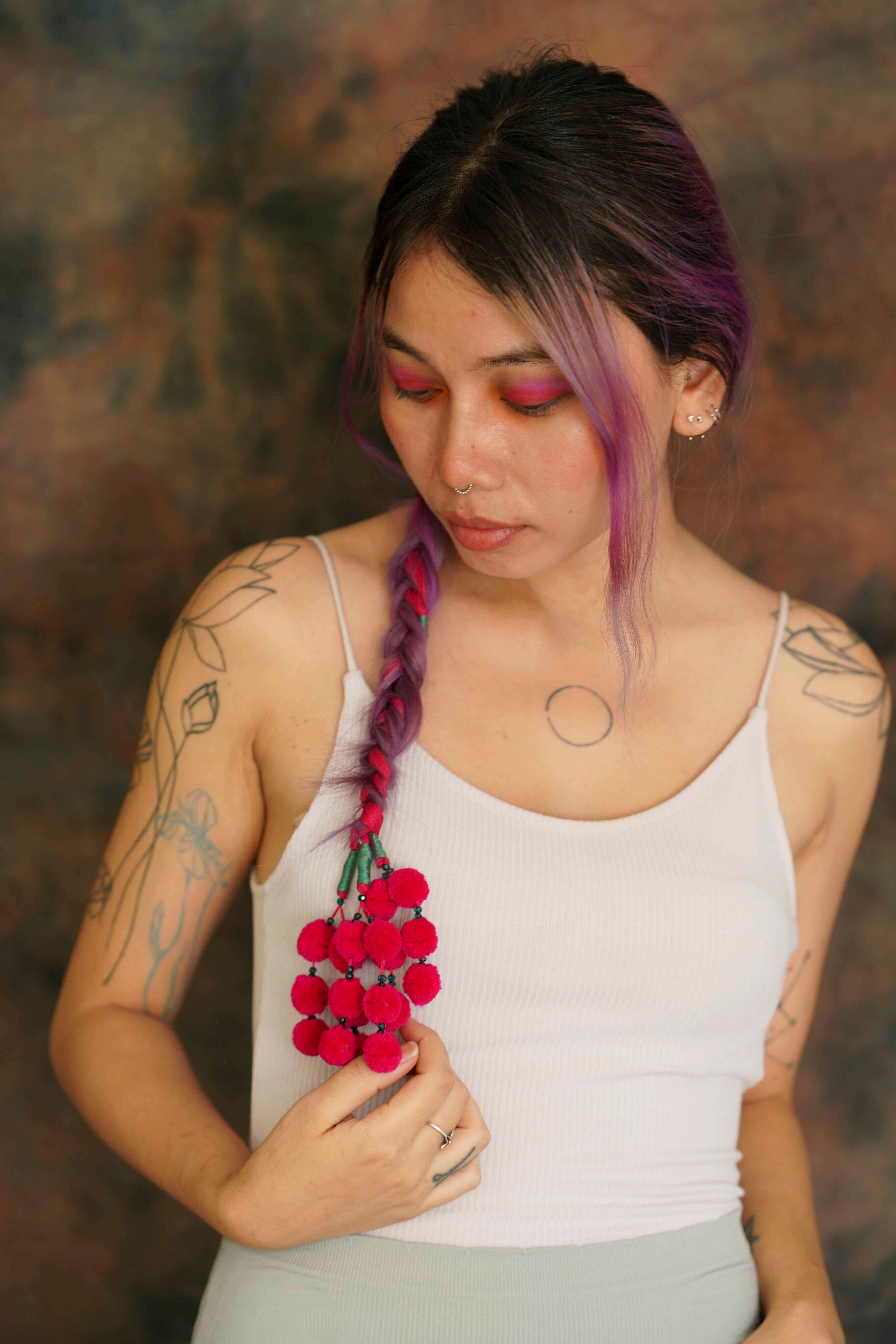 Pompones del tamaño de una cereza hechos a mano, perfectamente redondos, unidos para darle ese aspecto lindo. Combínalo con tus atuendos occidentales o étnicos y juega.