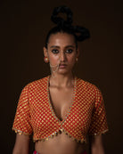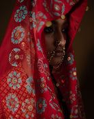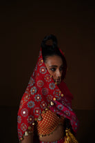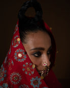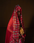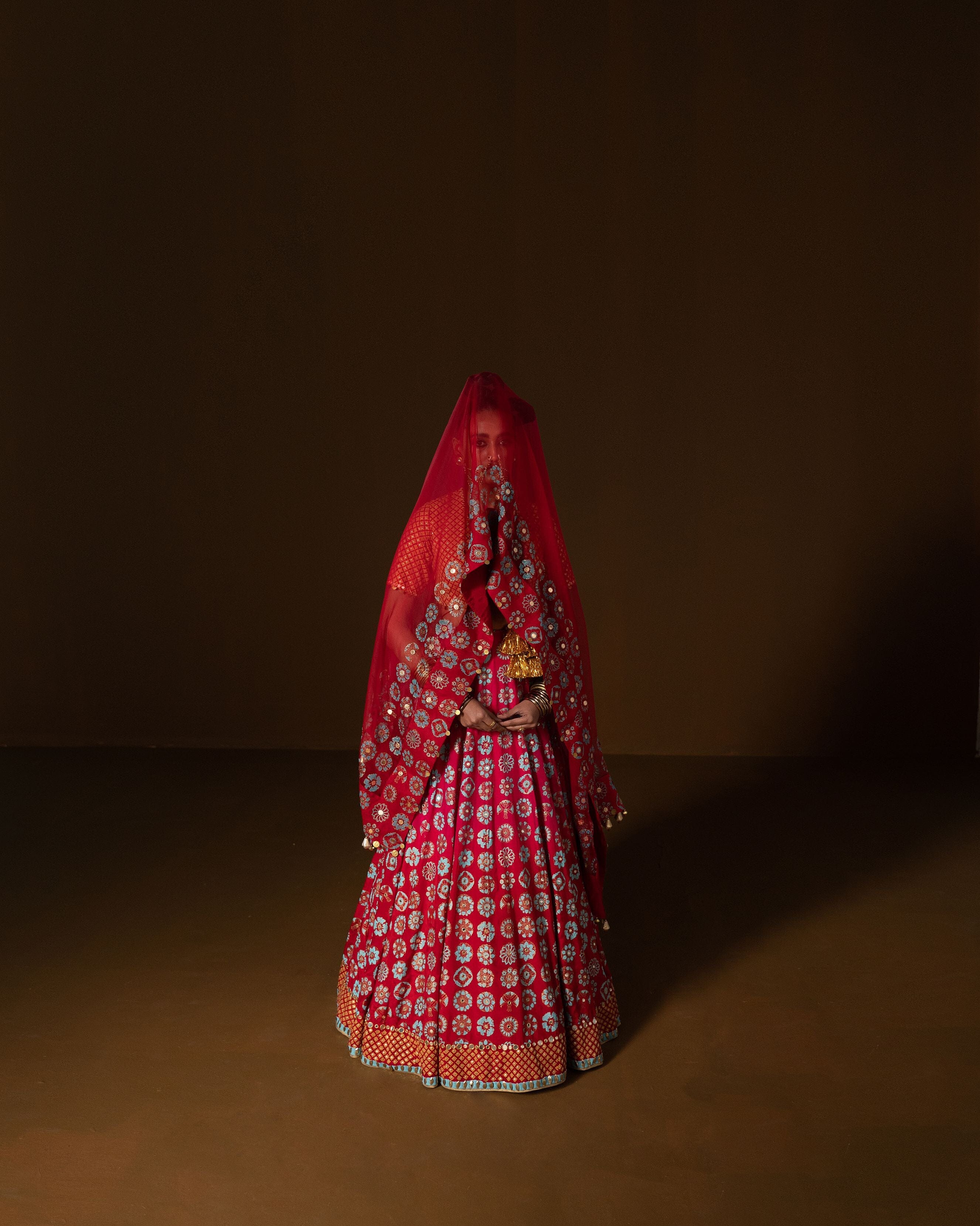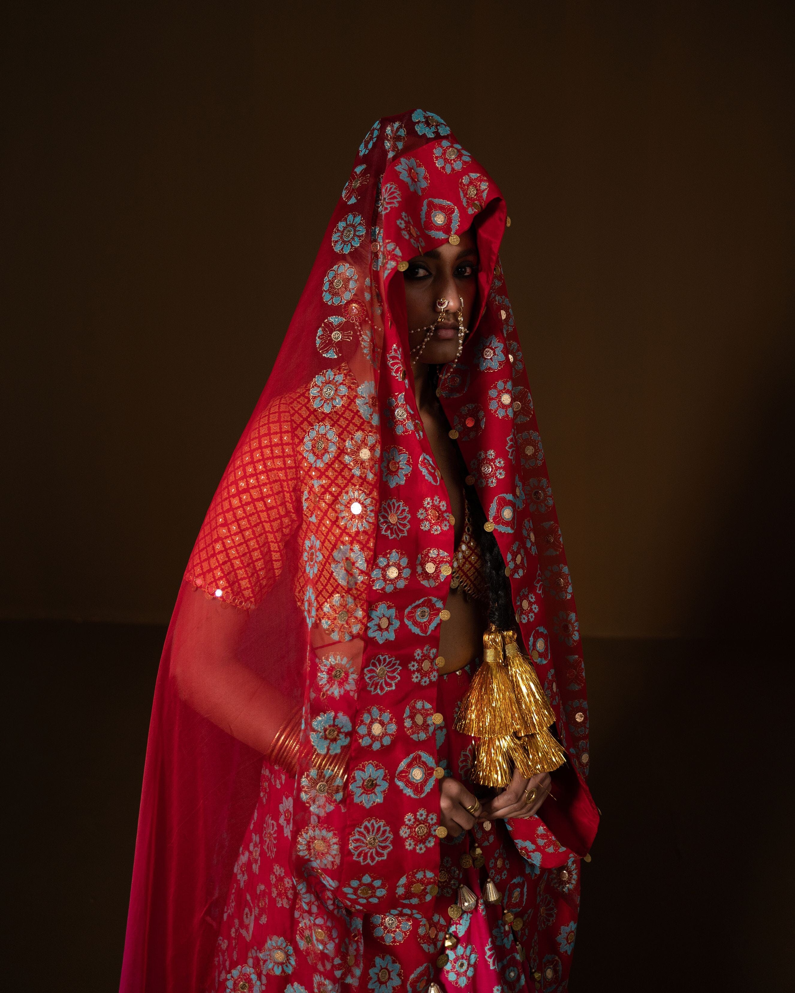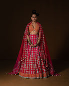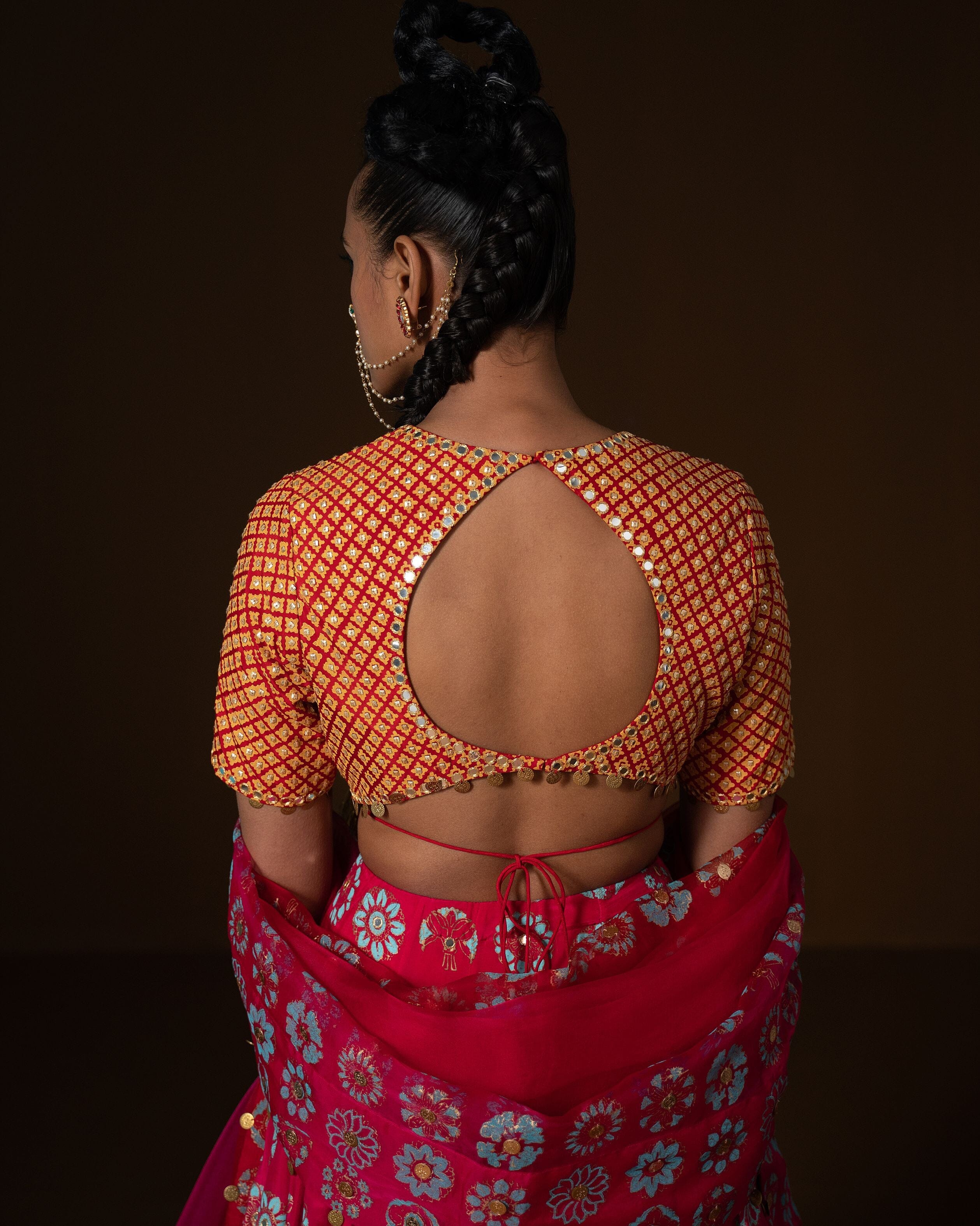 ANARDANA LEHNGA: esta lehnga está confeccionada en una lujosa seda de verano con 12 tipos de flores impresas en toda la base, colocadas de manera geométrica, y está unida con un intrincado borde geométrico. Está bordado a mano en espejo pequeño y bordado de lentejuelas. La blusa está estampada con un pequeño patrón geométrico y luego bordada con lentejuelas de forma cuadrada. Ombre Dupatta está impreso y bordado en los bordes y tiene detalles metálicos para colgar monedas.
