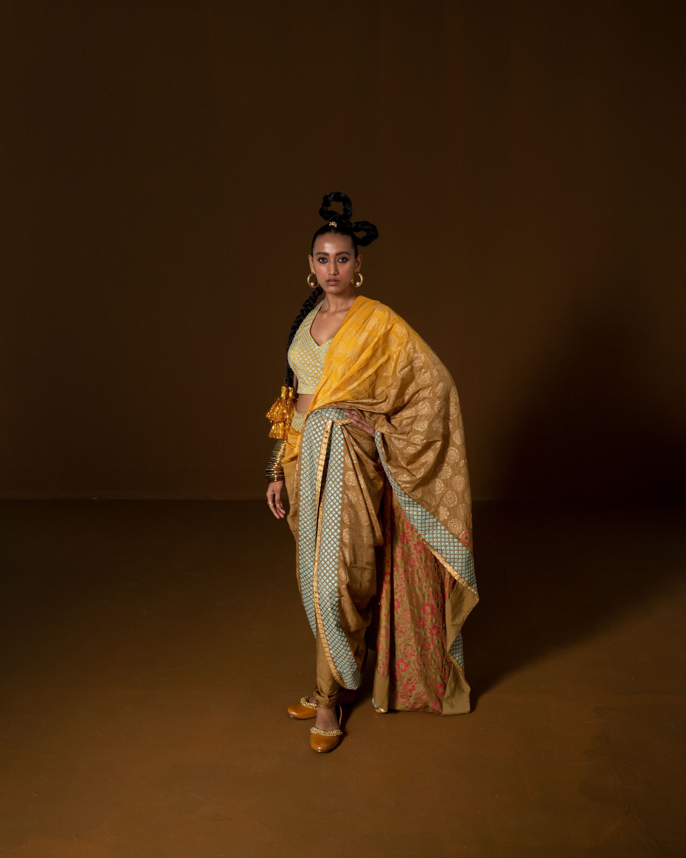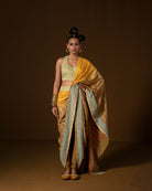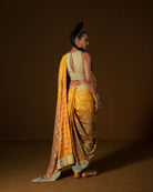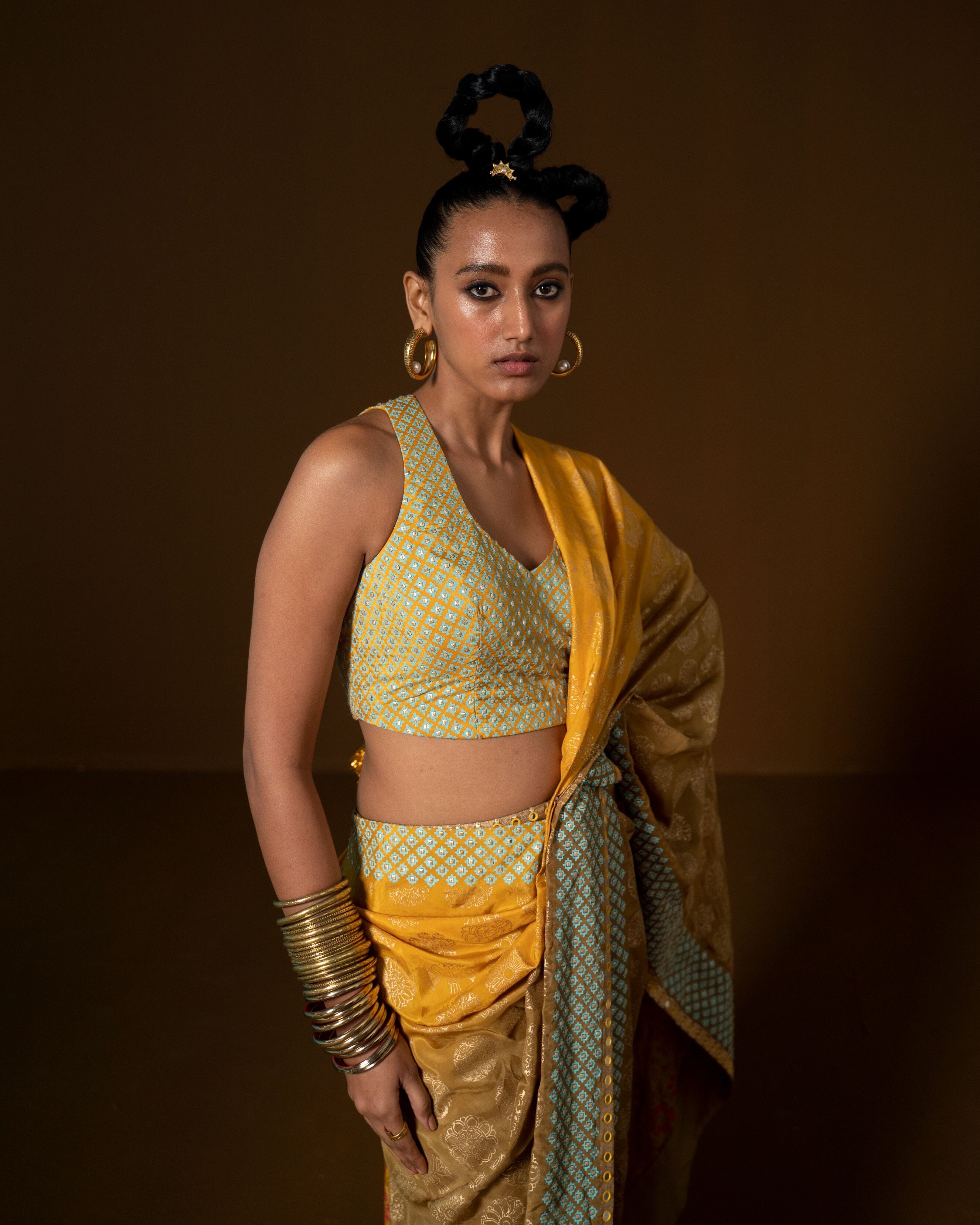 CHAKRA PHOOL SARI AMARILLO: este sari de seda de verano está drapeado y bordado a mano a lo largo de los bordes y pallu. La blusa está encorsetada y completamente bordada a mano con intrincadas lentejuelas.