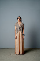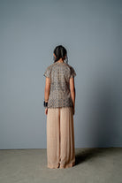 Mono extragrande de crepé con estampado de bloques a mano que se adapta a todo tipo de cuerpo, combinado con una chaqueta estructurada pero drapeada bordada a mano con una textura de malla triangular.