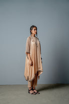 El conjunto está confeccionado en suave raso de algodón con detalles de estampado por colocación y bordado geométrico a mano. Su detalle de manga extragrande en georgette hace que este estilo sea bastante interesante. Se combina con pantalones estampados cónicos.