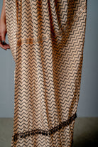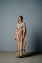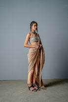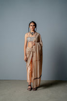 Es un sari drapeado con pantalones adjuntos. Está confeccionado en tela crepé con estampado personalizado y detalles de colgantes y bordados a mano en el pallu. Se combina con un corpiño de cutadana totalmente incrustado con colgantes de cristal bordados a mano.
