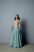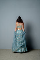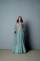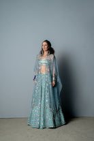 El georgette lehnga está confeccionado con un estampado de bloques de mano de malla triangular por todas partes, bordado a mano con lentejuelas triangulares brillantes y mate. La blusa está totalmente bordada a mano con una interesante textura de lentejuelas. Viene con una capa de organza pura con una base transparente con estampado de bloques y bordado colocado. Esto también se detalla con tapices kauri en el dobladillo y la sisa.