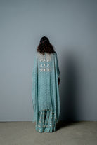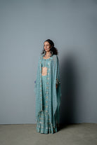 La georgette sharara está confeccionada con un estampado de bloques de mano de malla triangular por todas partes, bordado a mano con lentejuelas triangulares brillantes y mate. El top corto haulter tiene un detalle de estampado de rayas con un intrincado bordado a mano de cutdana. en el dobladillo. Viene con una capa con una base transparente con estampado de bloques de color marfil y bordado colocado. La capa también está detallada con tapices kauri en algunos lugares.