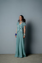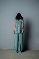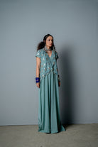 Mono extragrande de crepé con estampado de bloques a mano que se adapta a todo tipo de cuerpo, combinado con una chaqueta estructurada pero drapeada bordada a mano con una textura de malla triangular.