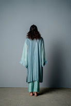 La kurta está cortada en estilo cachemir pheran, con una serigrafía personalizada de un intrincado mosaico jaali en el frente y rayas en la parte posterior. La parte delantera de esta kurta está intrincadamente bordada a mano con espejo y cutdana por todas partes. Se combina con pantalones pitillo de satén de algodón.