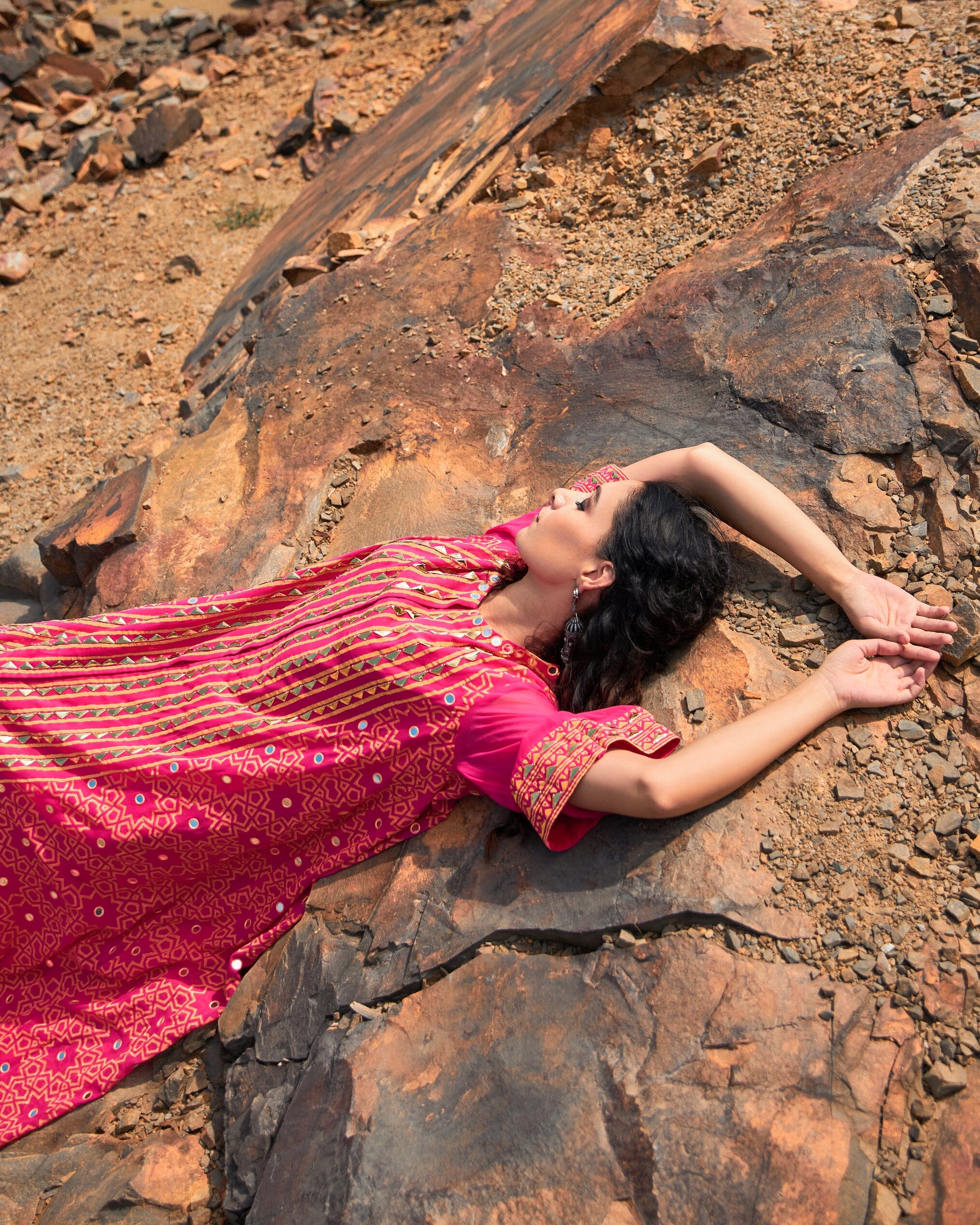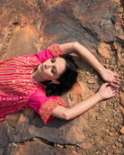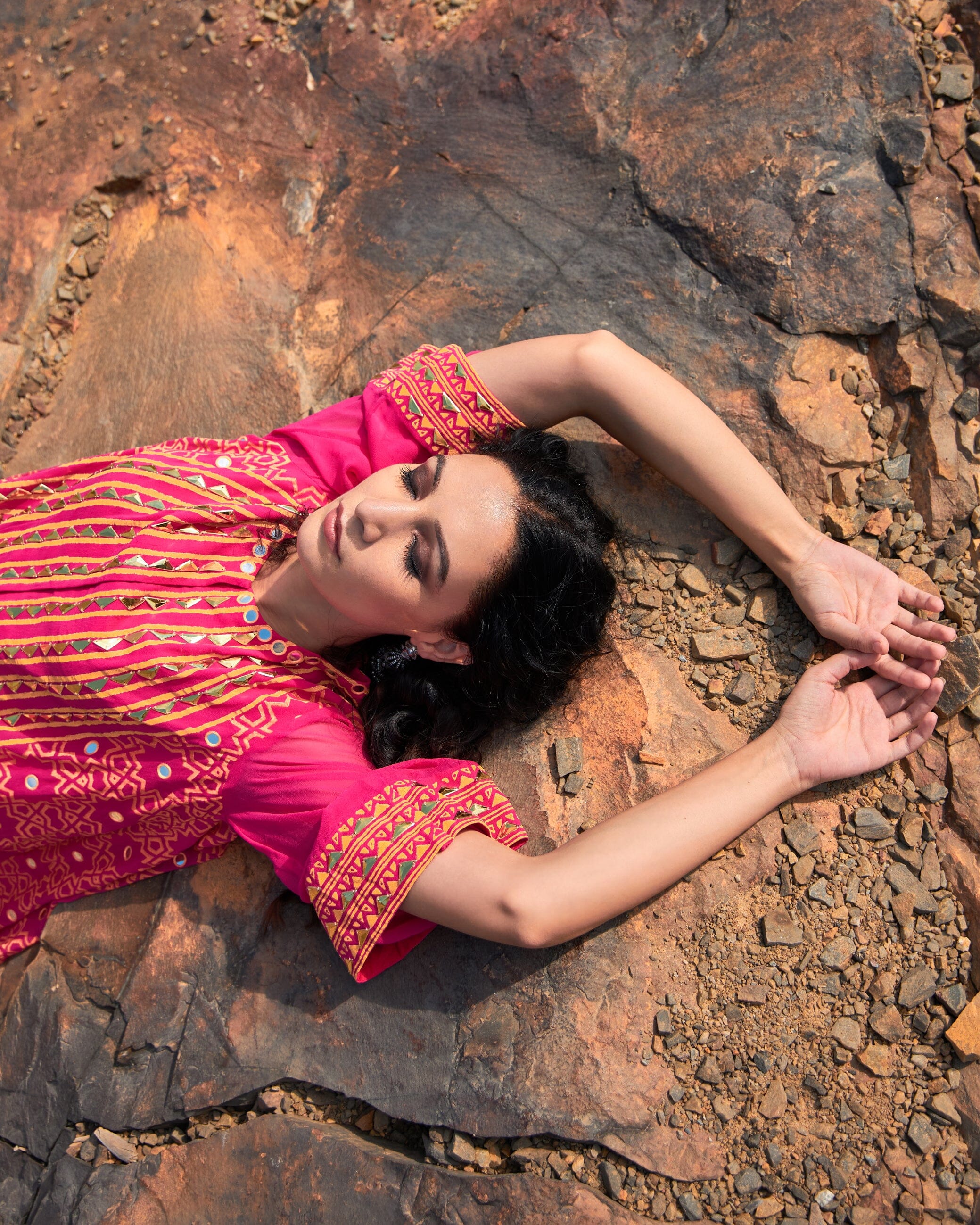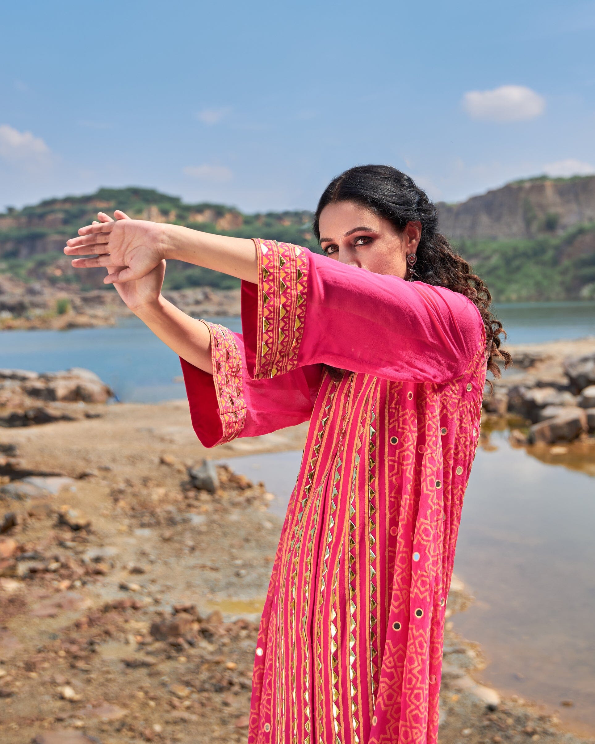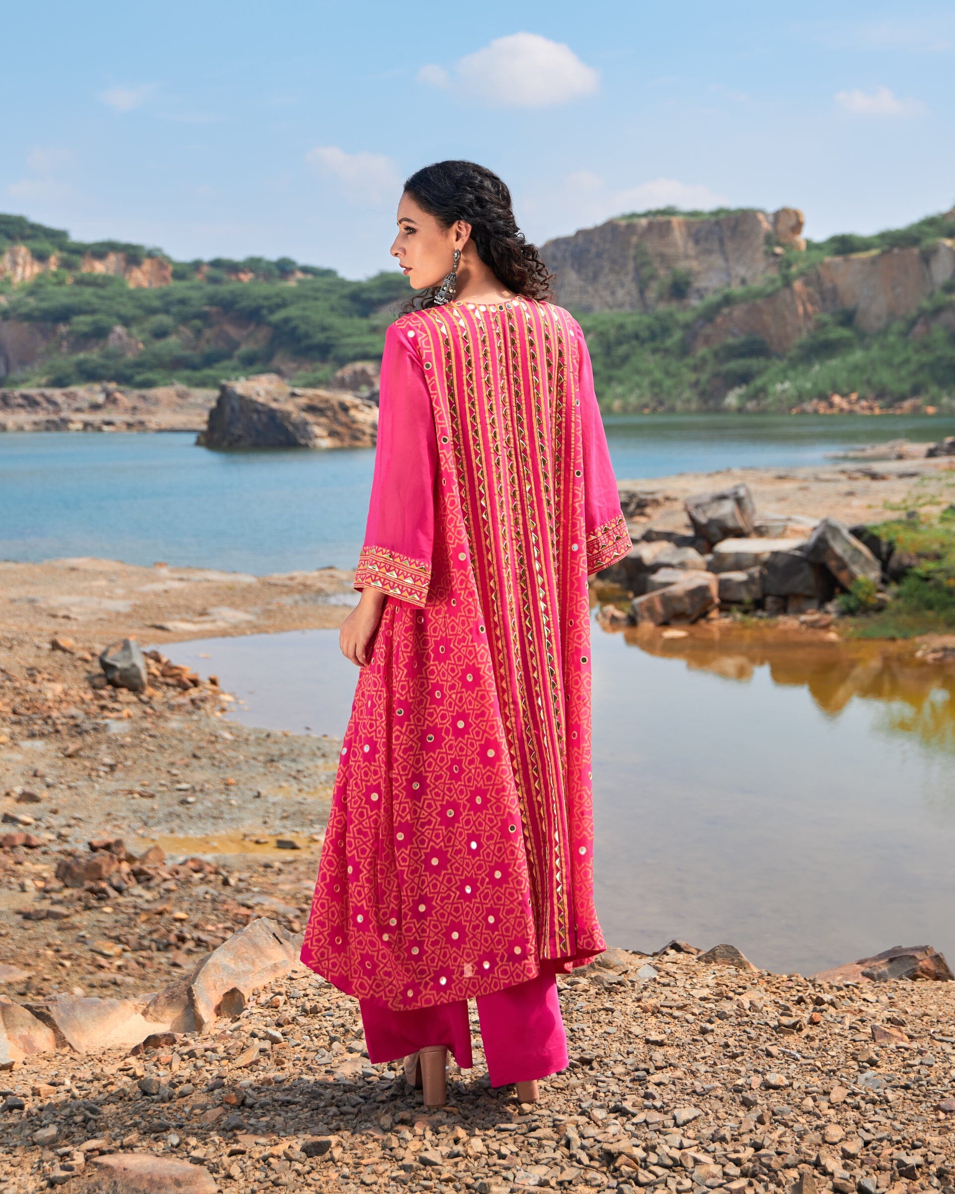 Este conjunto de kurta está confeccionado en georgette puro de 60 gramos con una base de estampado personalizado adornada con lentejuelas geométricas y bordados a mano en espejo por toda la parte delantera y trasera. Se combina con pantalones anchos de crepé.