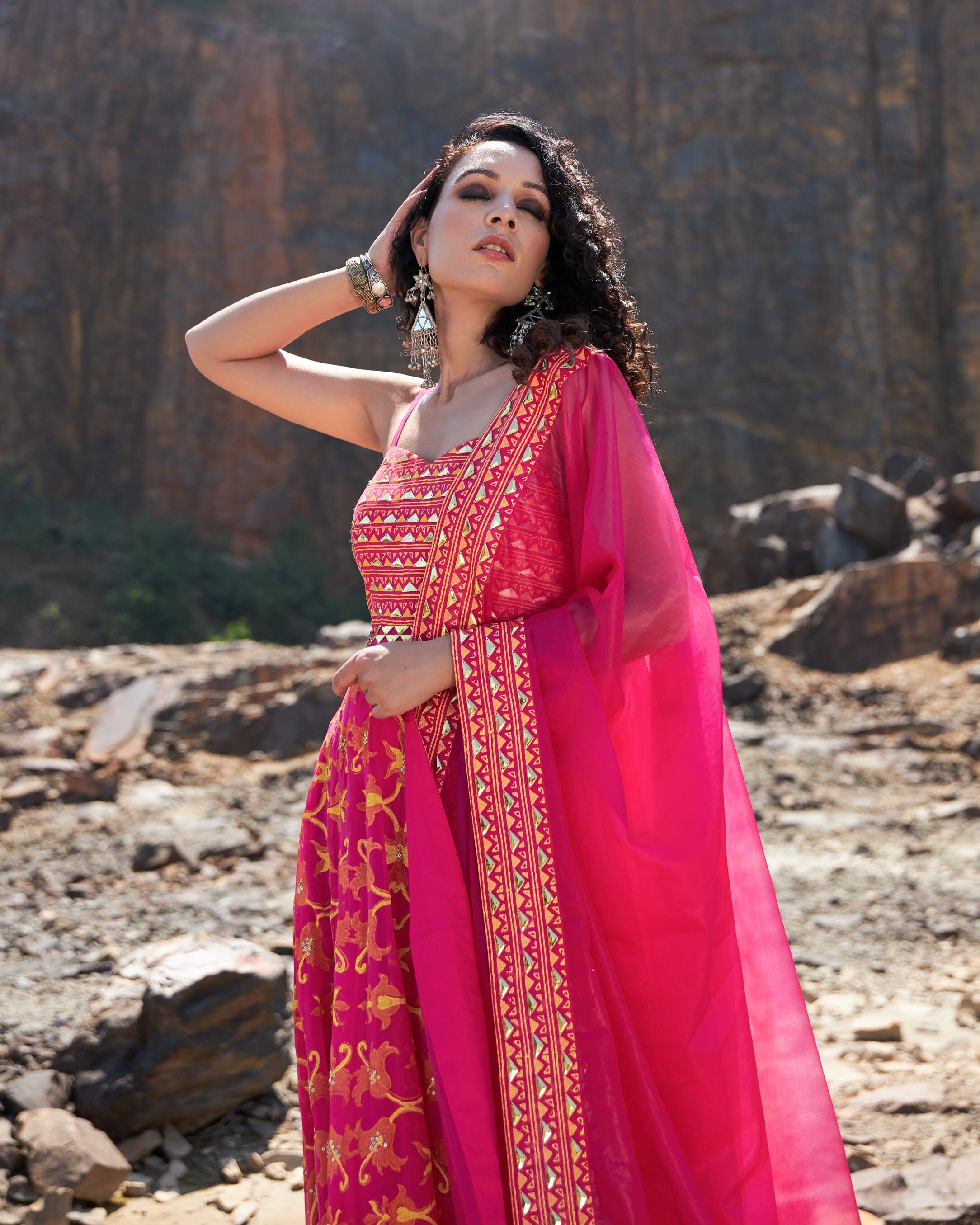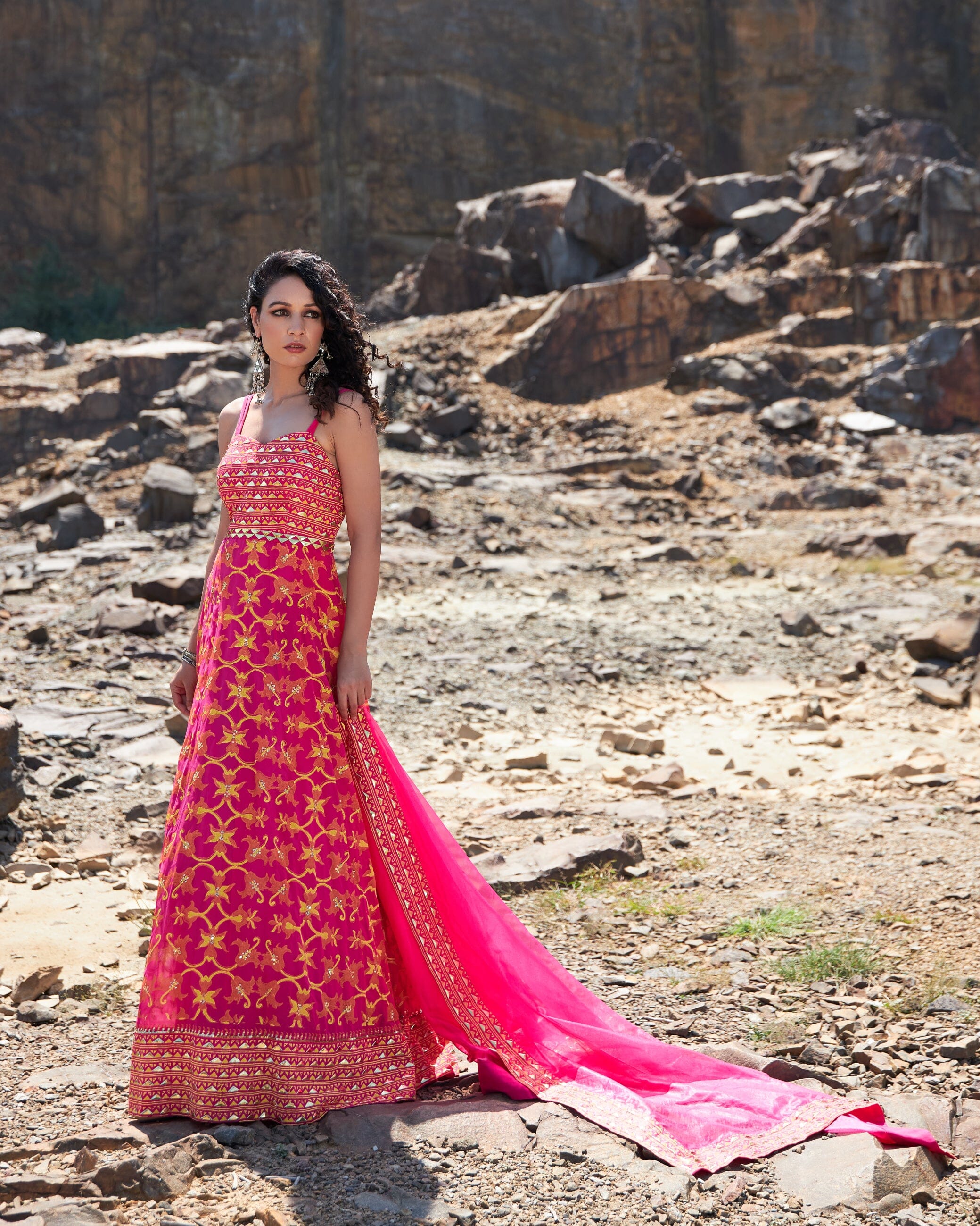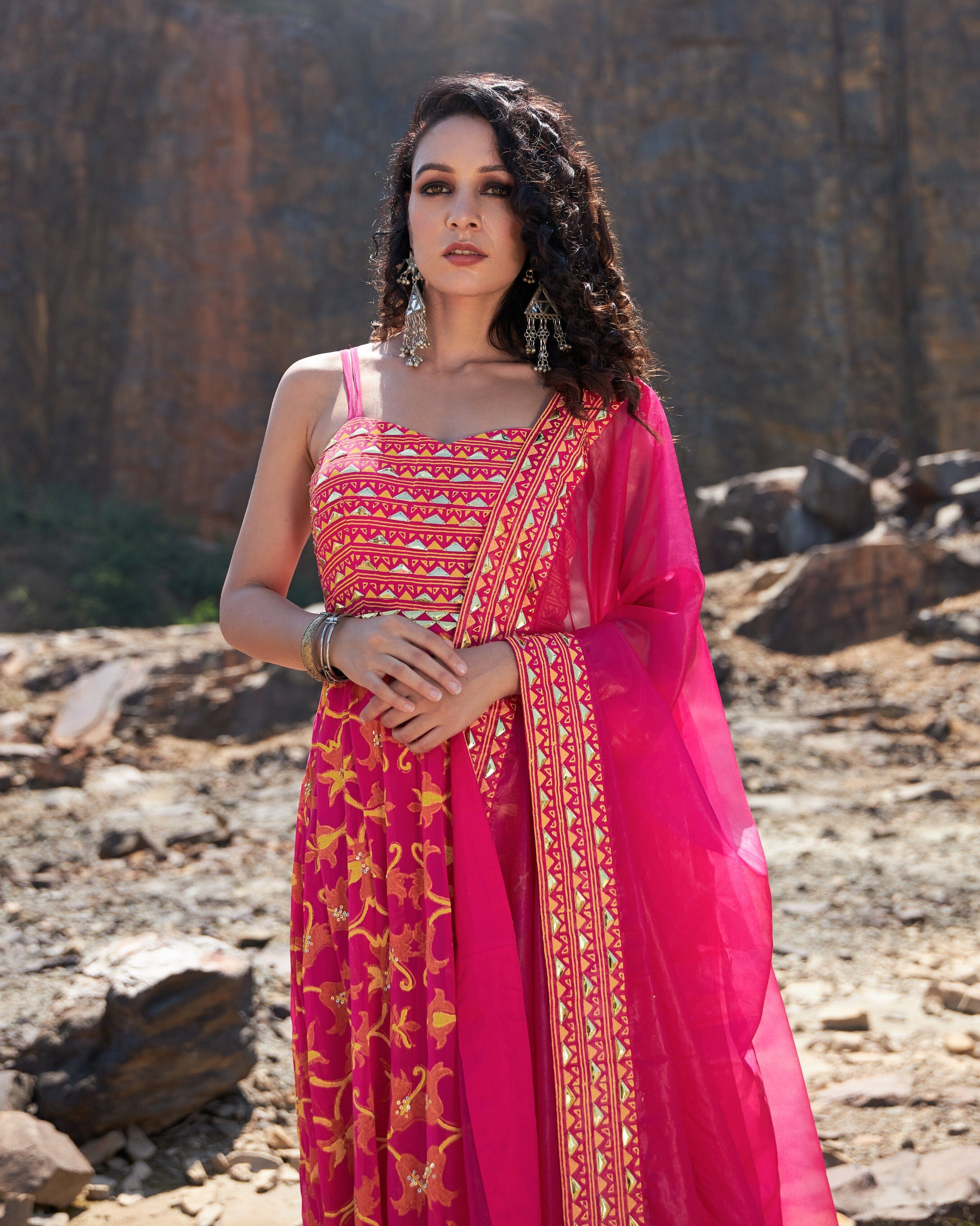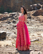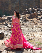 Este conjunto Anarkali está confeccionado en georgette puro de 60 gramos con una base de estampado personalizado adornada con lentejuelas geométricas bordadas a mano por todas partes. Se combina con una dupatta de organza con estampado personalizado y trabajo manual en los 4 lados.