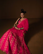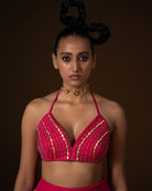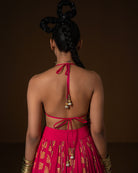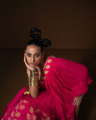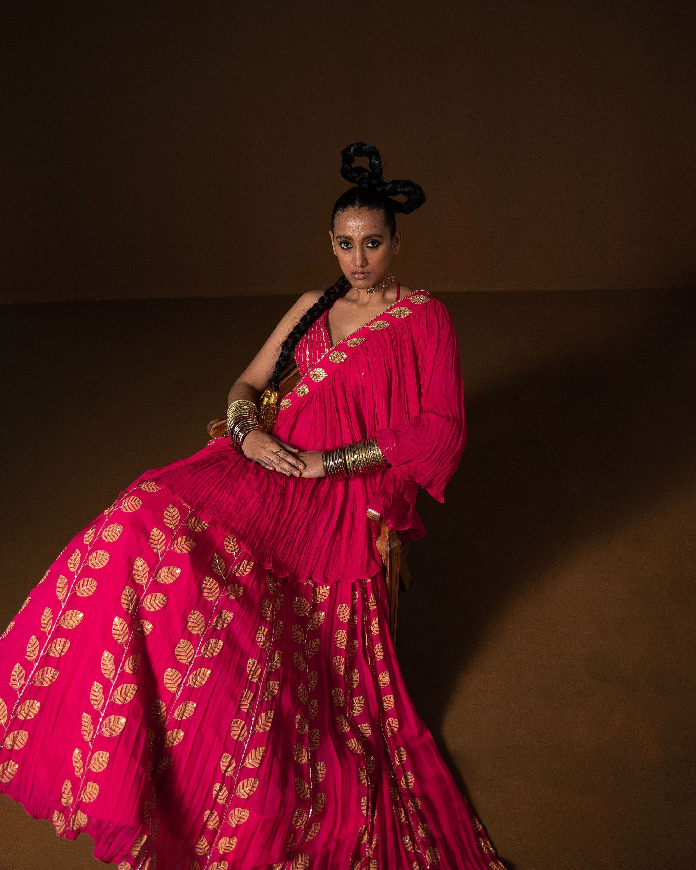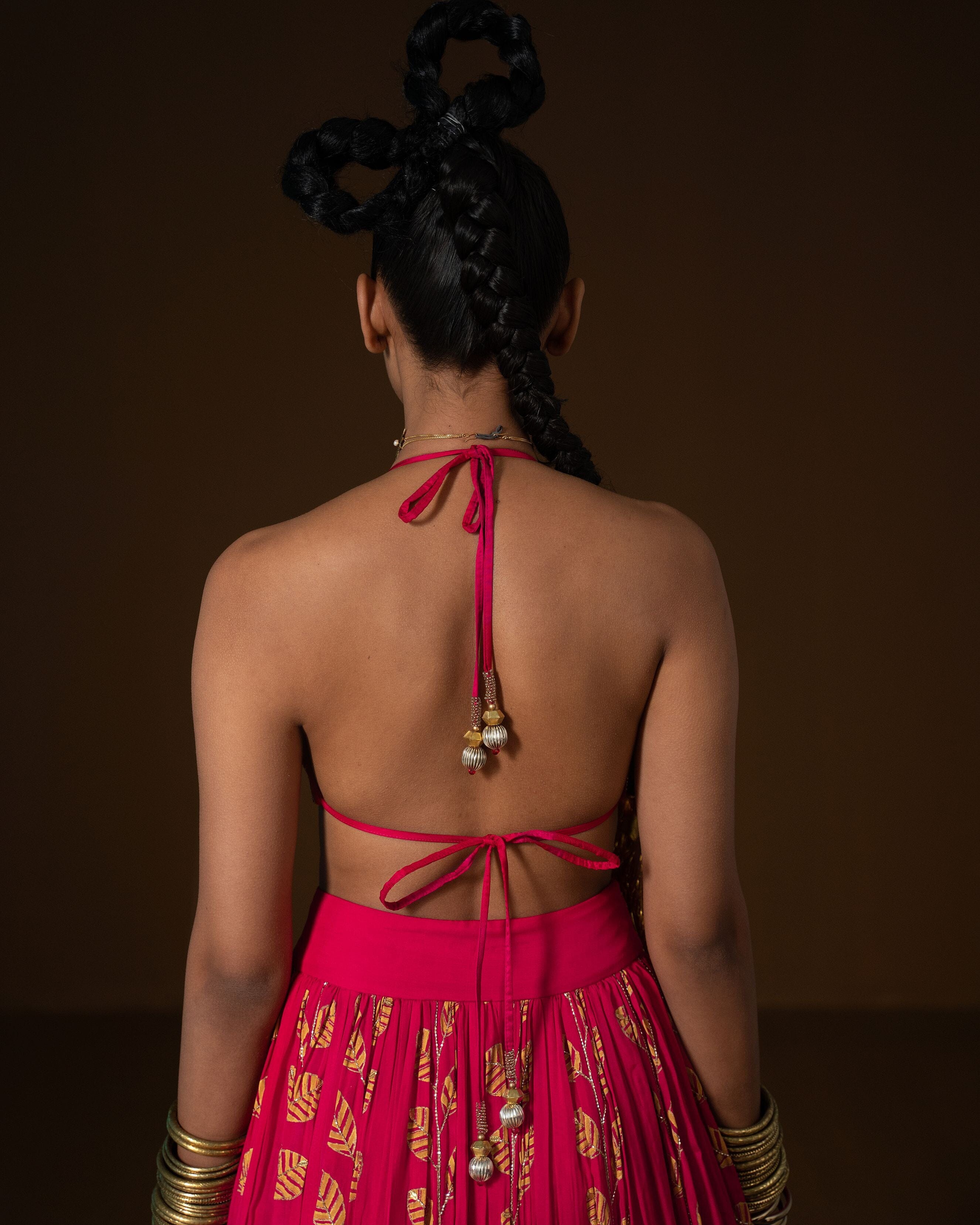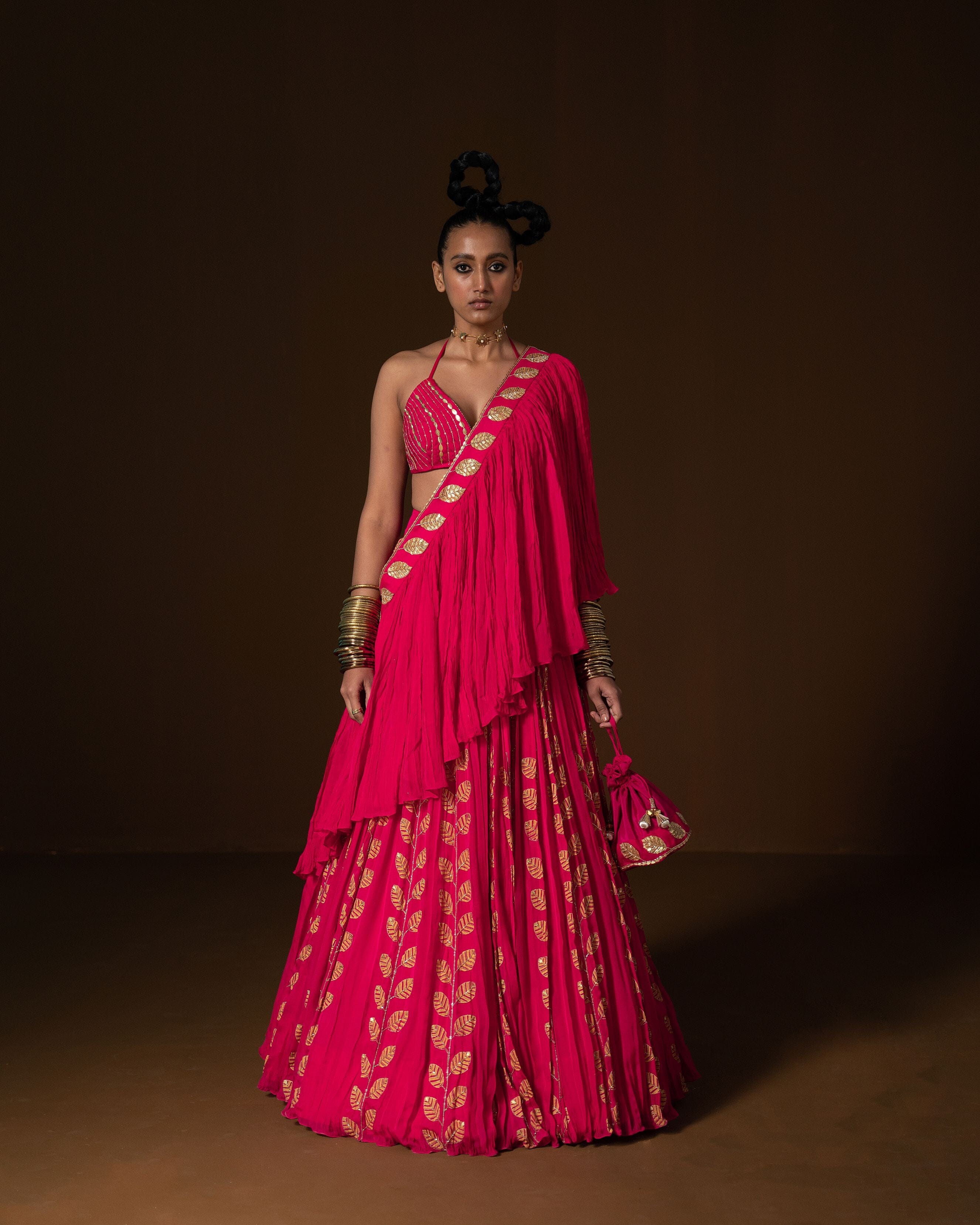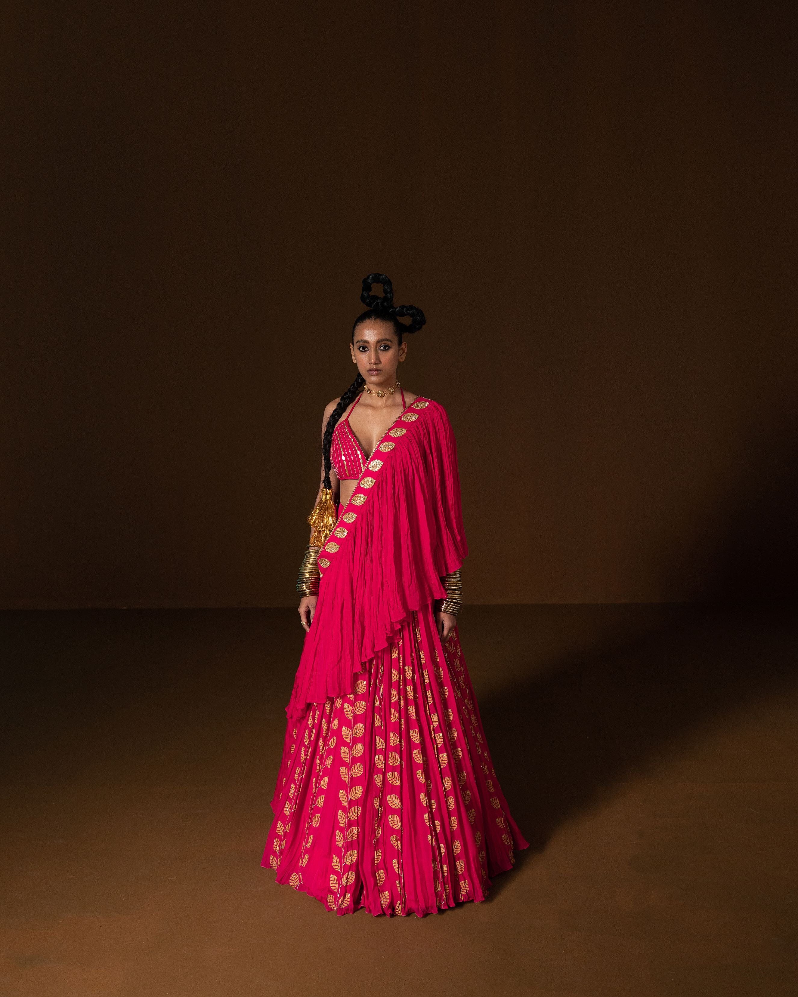 JAVITRI LEHNGA: Se trata de una lehnga muy fruncida, con una ghera extensa, confeccionada en gasa plana. Toda la lehnga está impresa con un hermoso motivo de hojas y luego bordada a mano con lentejuelas personalizadas y cutdana. La dupatta también está precosida con una hermosa banda bordada a mano. El bralet tiene una textura de base microplisada con bordados a mano por todas partes.