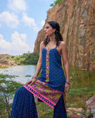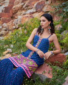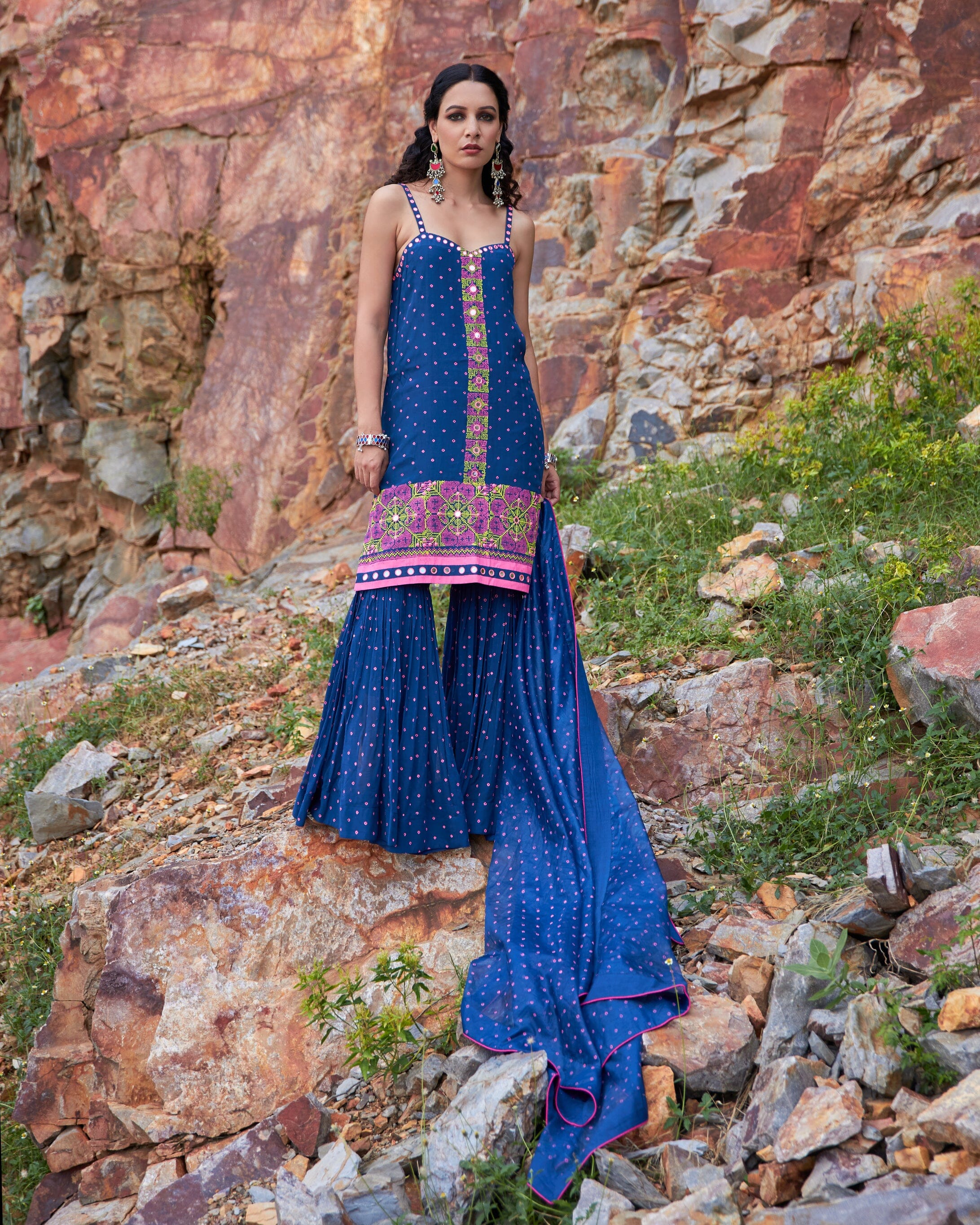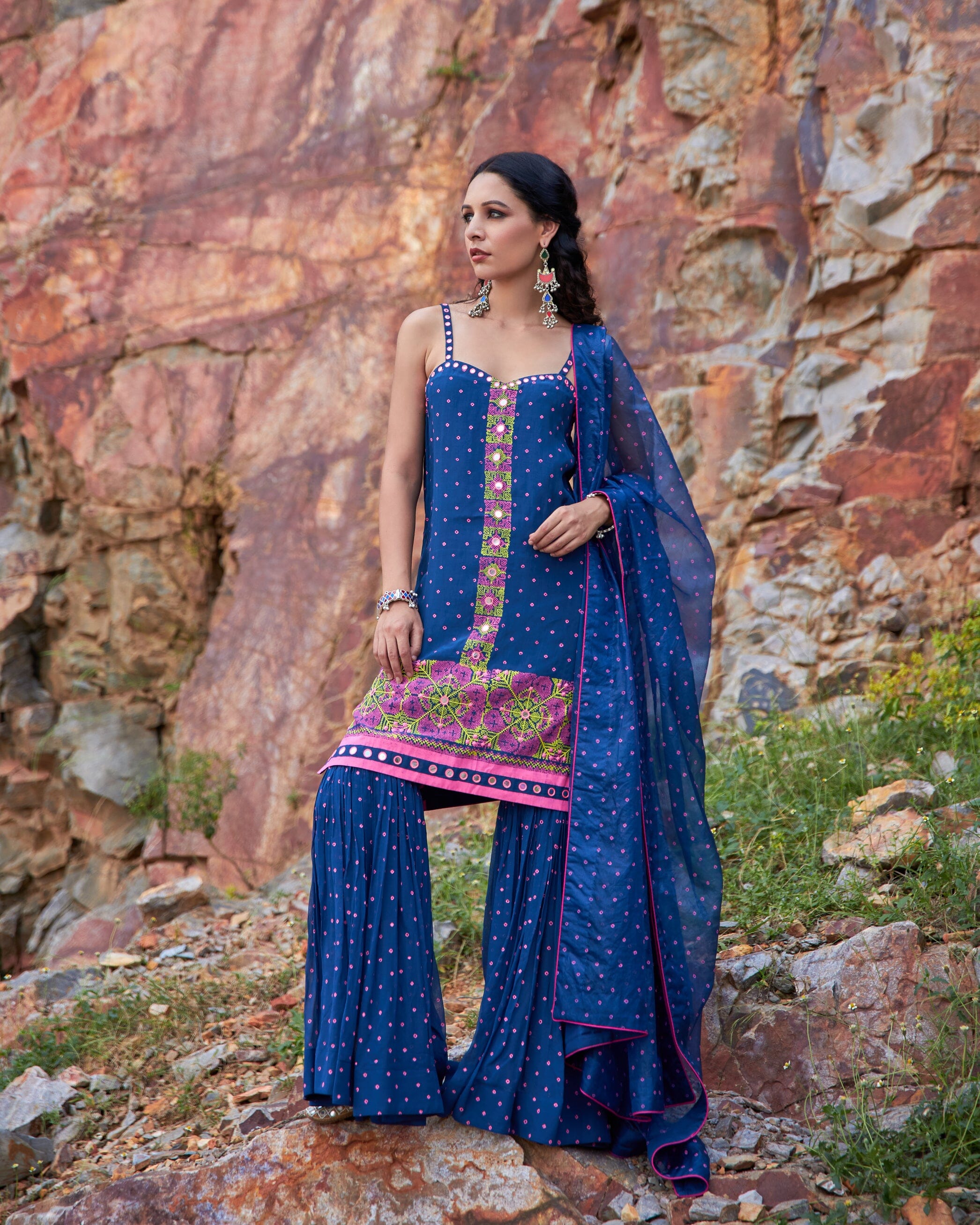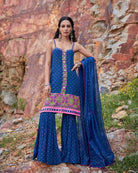 Este conjunto Sharara está confeccionado en crepé puro de 60 gramos con una base de estampado personalizado adornado con lentejuelas geométricas y bordados a mano en forma de espejo por todas partes. Se combina con una dupatta con estampado personalizado de organza y una sharara con estampado personalizado en georgette.