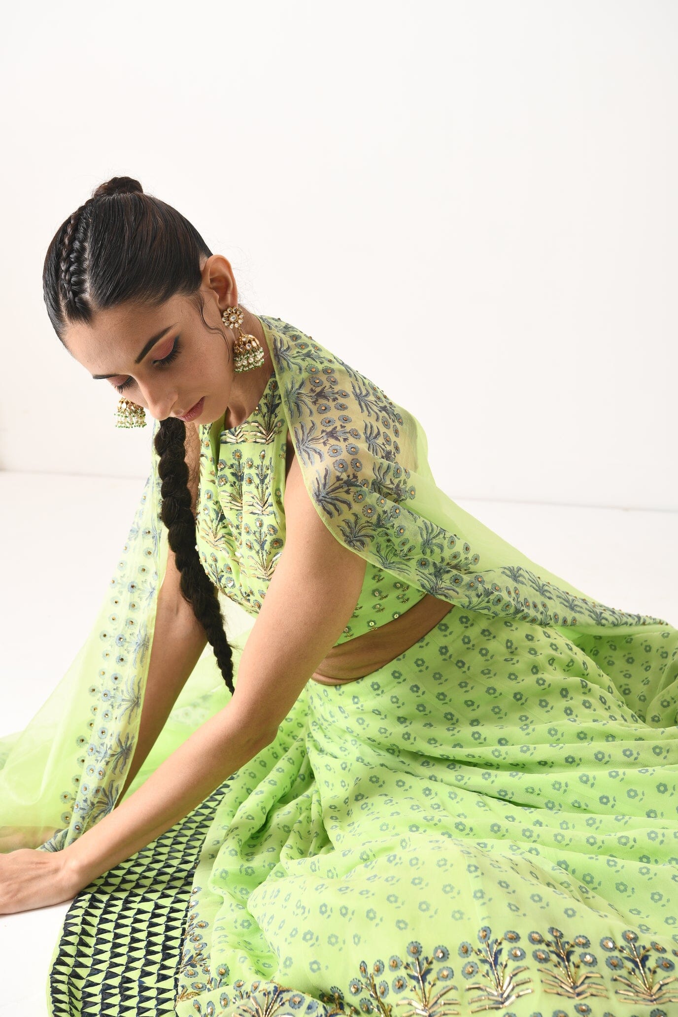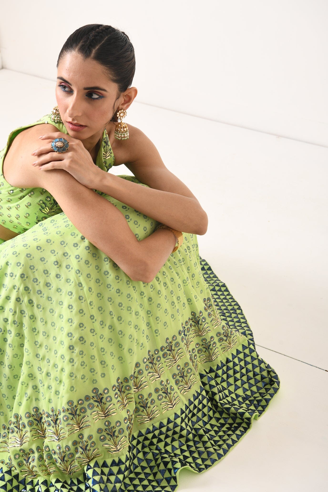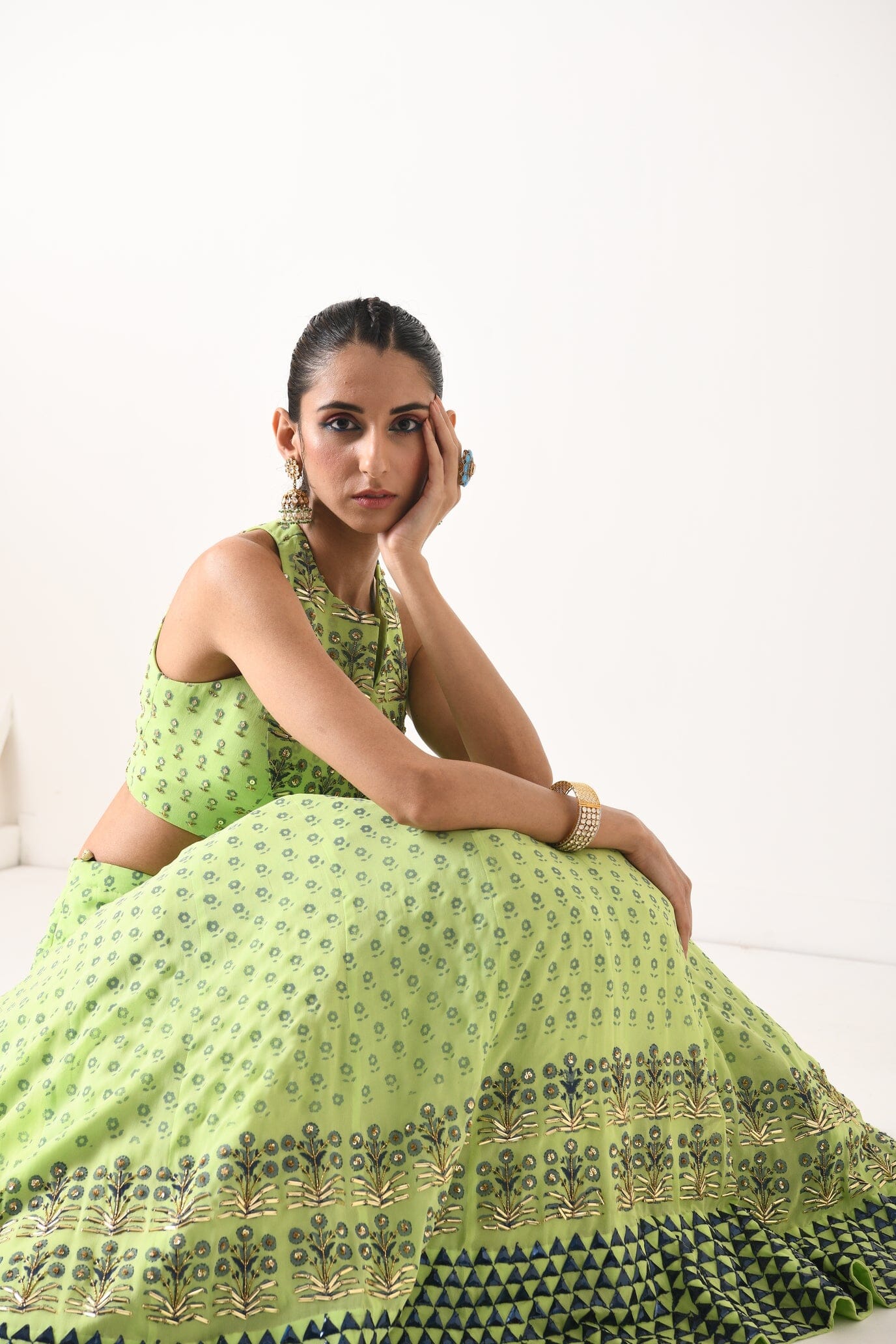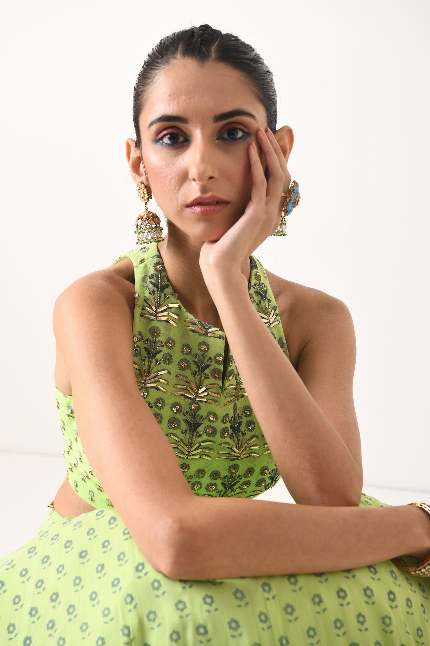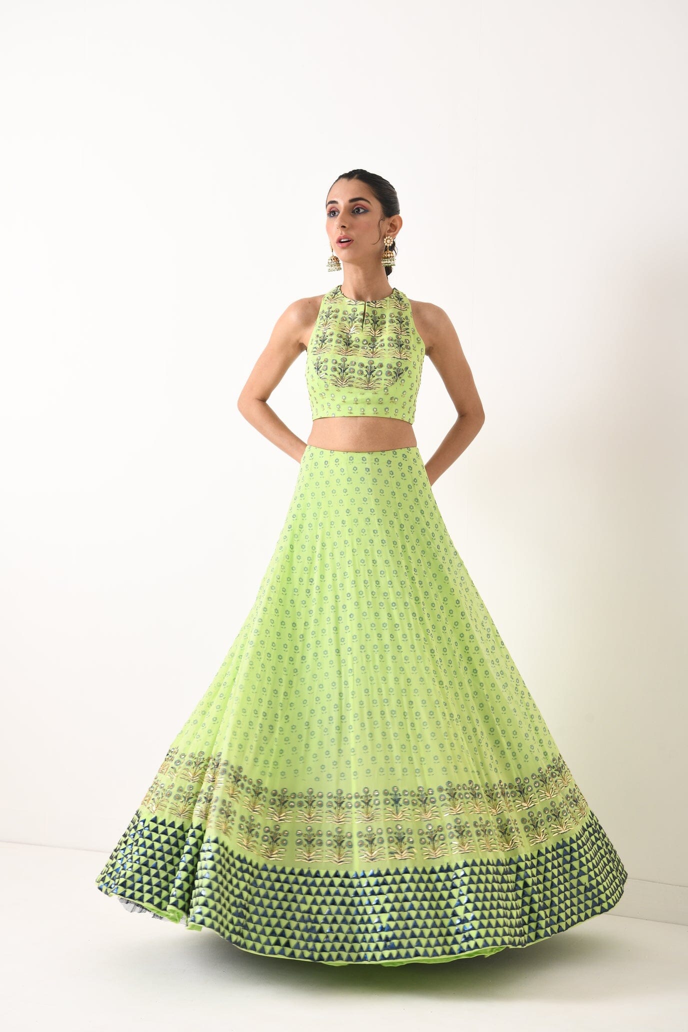 Confeccionada en georgette puro de 60 gramos, esta lehnga tiene una base impresa en bloque personalizada con interesantes lentejuelas geométricas y bordados a mano cutdana por todas partes. Se combina con una blusa halter bordada y una dupatta de organza pura que tiene el mismo estampado y pegatinas de Swarovski en los 4 lados.
