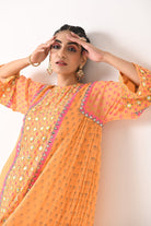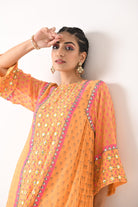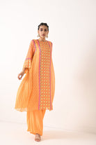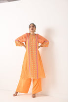 Confeccionada en georgette puro de 60 gramos, la kurta estilo choga en color naranja sorbete tiene un estampado rosa neón y un bordado con motivo de estrellas en el panel frontal central y los puños. Se combina con pantalones anchos de crepé.