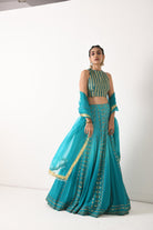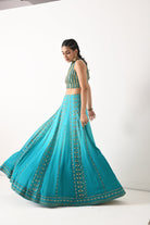 Confeccionada en georgette puro de 60 gramos, esta lehnga tiene una base impresa en bloque personalizada con interesantes hojas geométricas como lentejuelas y bordados a mano de cutdana en toda la falda y la blusa. Se combina con una blusa halter bordada y una dupatta de organza pura que tiene el mismo bordado en los 4 lados.