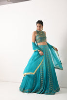 MOTIVO HOJA DORADA TEAL LEHNGA