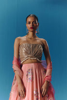 The Twilight Lehenga Set: Crepe Lehenga skirt paired with a lame' blouse and Organza dupatta . Embellished with hand embroidered sequin and pearls.
