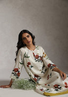 The dress features a relaxed and flowing silhouette crafted out of soothing cotton mul. It has a comfortable round neckline with a front placket and button opening. The hand painted botanical motifs are digitally placed all over the dress. The dress comes with a slip.