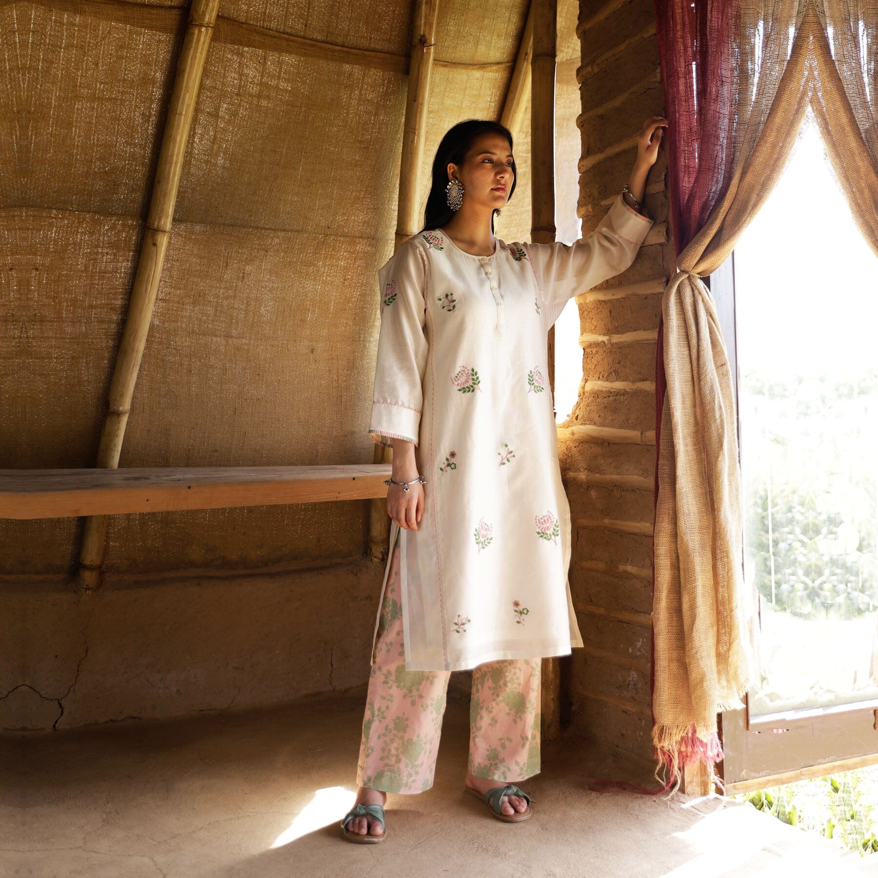 Una kurta tradicional de estilo kalidar con coloridos bordados a mano por todas partes. Viene con pantalón estampado y dupatta. Viene en un juego de 4 que incluye kurta, pantalones, dupatta y combinación.