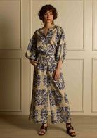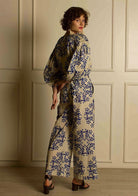Una camisa de corte recto con detalles plisados en las mangas le da un aspecto exagerado. El bordado a mano a lo largo del escote resalta la pieza. Esto se combina con pantalones anchos estampados para completar el look.