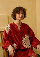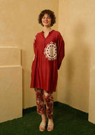 Una kurta anti-fit con apliques h. Esto se combina con pantalones rectos estampados. Viene en un juego de 2. La kurta viene con un engobe.