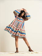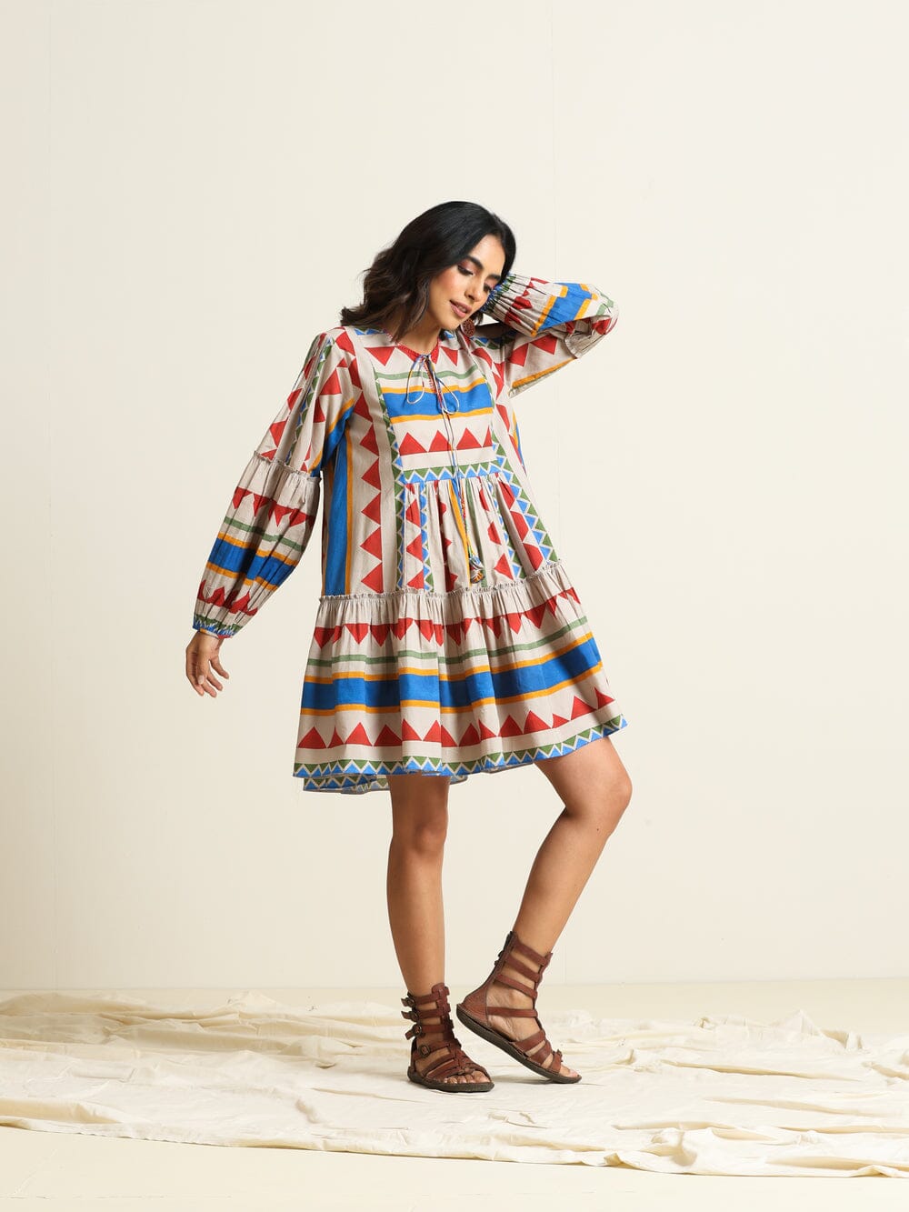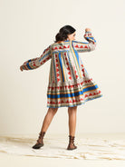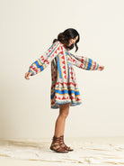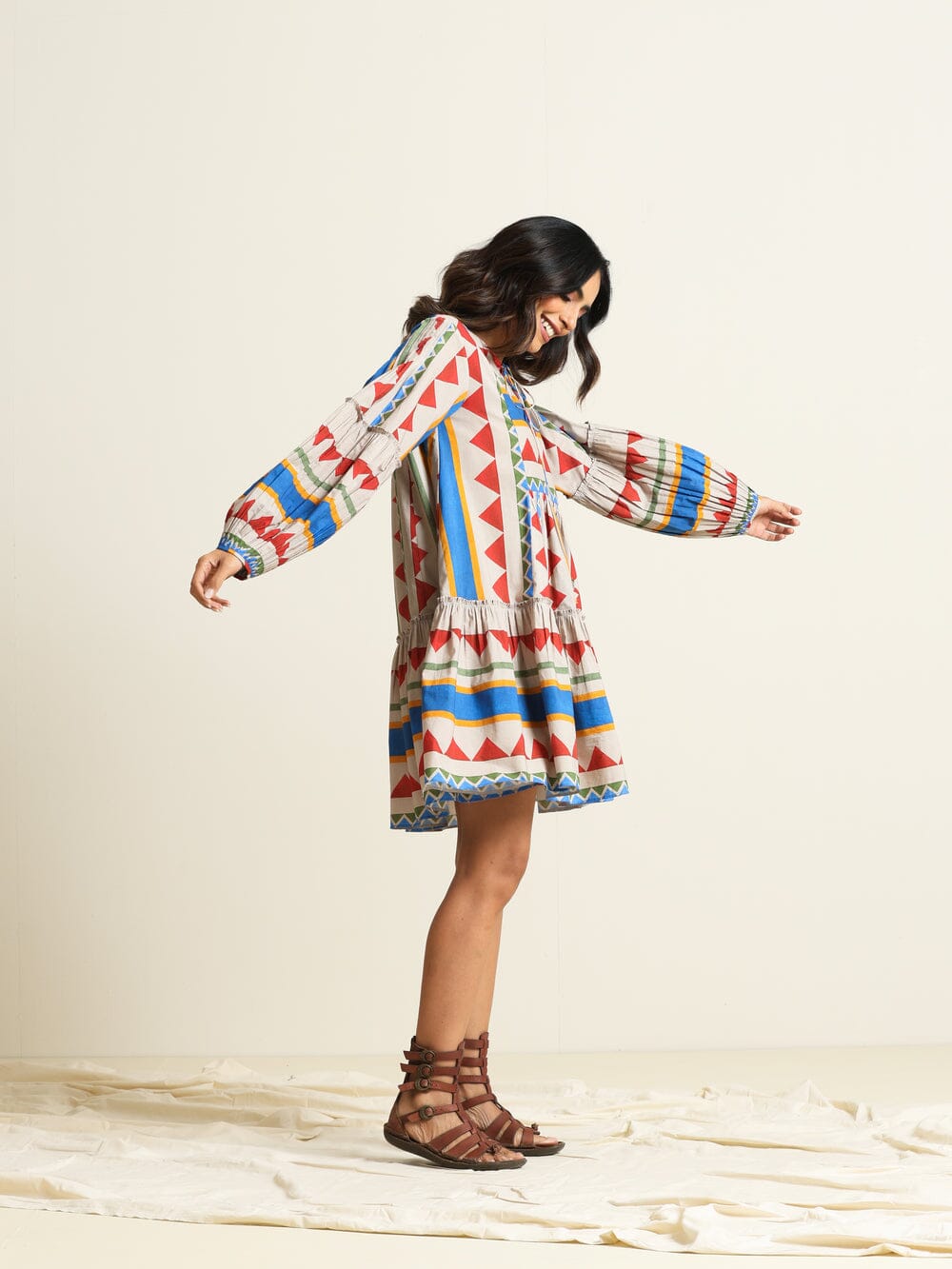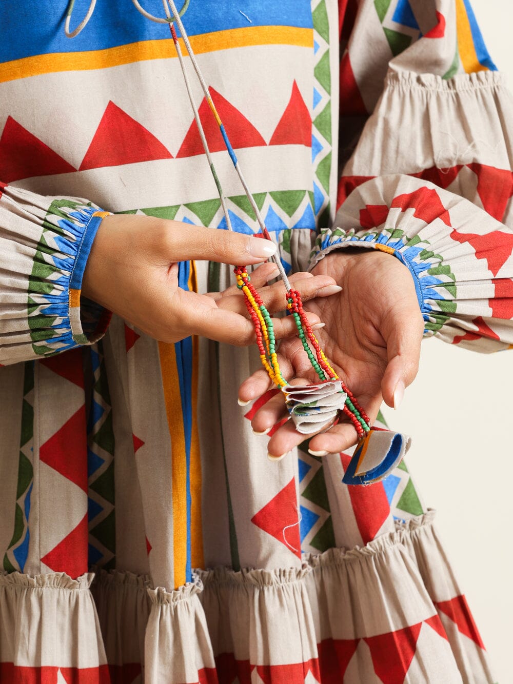 Made from soft and luxurious cotton, our Ember dress features geometric print cut in a flattering silhouette. The neckline is beautifully finished with a delicate hand embroidery and hand-made beaded tassels.