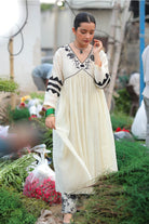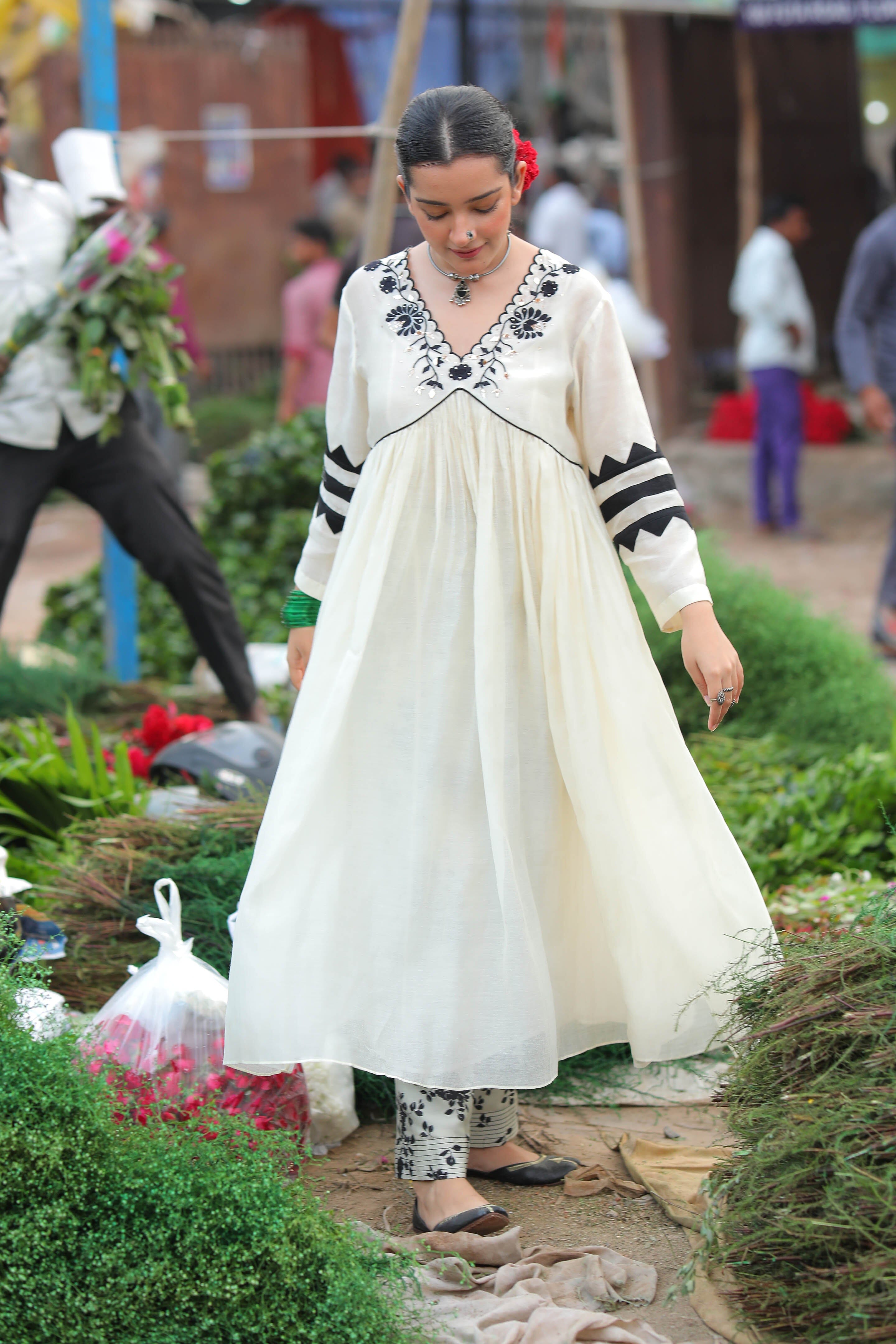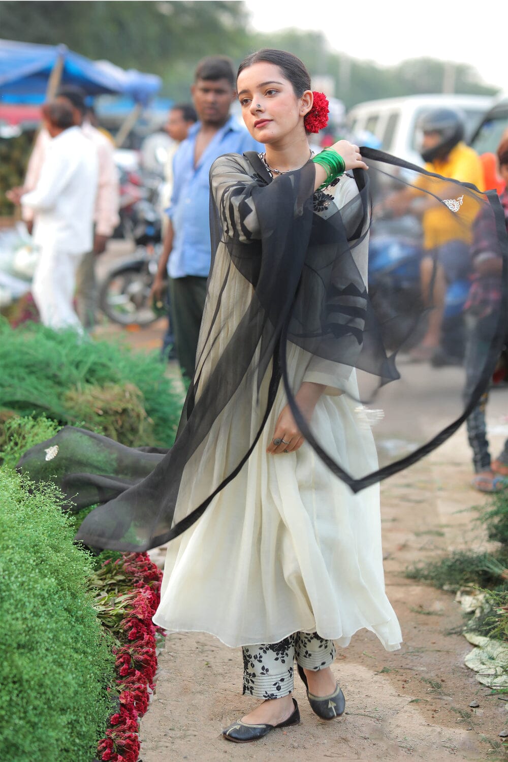 La túnica presenta una silueta favorecedora con un delicado bordado a mano alrededor del cuello. Esto se combina con pantalones estampados y dupatta de organza con motivos bordados en las esquinas. Viene en un juego de 4 que incluye kurta, pantalones, dupatta y combinación.