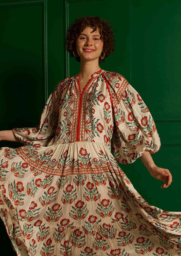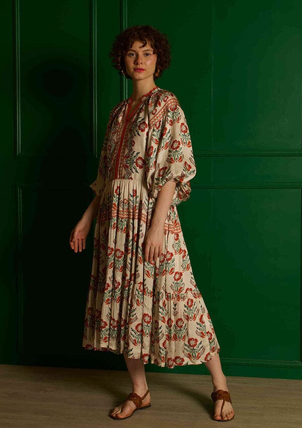 Inspirado en el estilo campesino, este vestido presenta una silueta favorecedora en suave tejido modal.