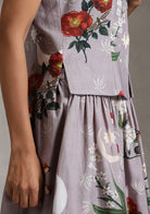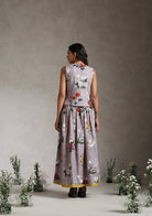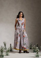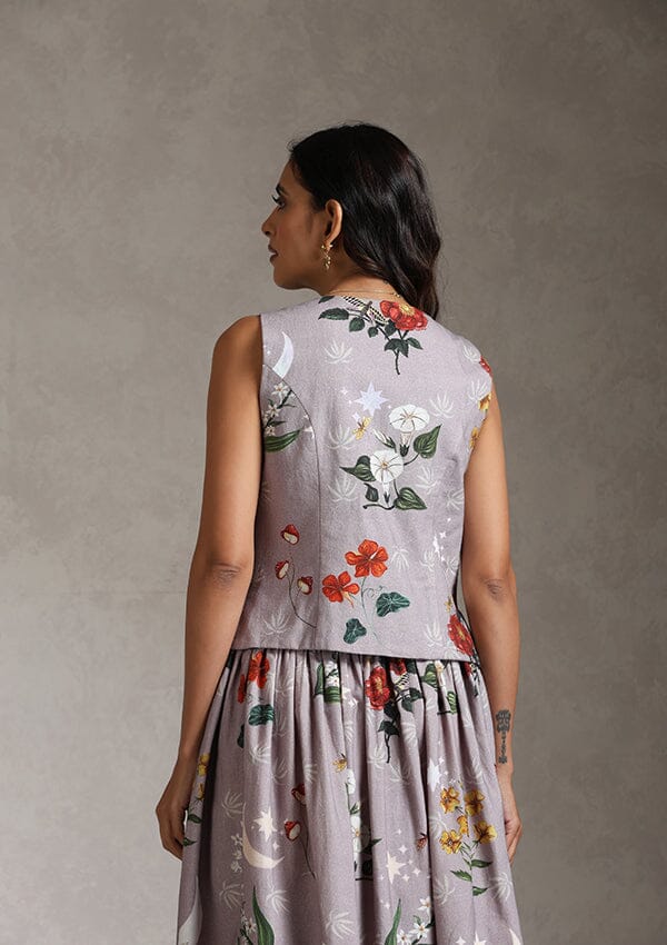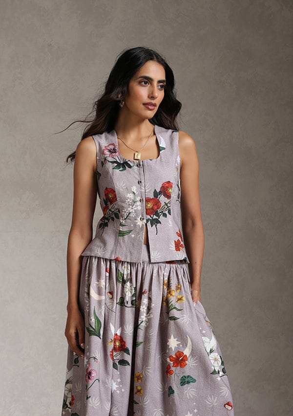 This coordinated set features a printed waist coat paired with an ankle-length gathered skirt giving an elevated look. The skirt comes with a front belt, an elasticated back and a side zipper opening.