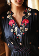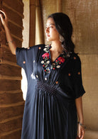 Bordado a mano sobre tela modal, este vestido incorpora un fruncido en forma de panal delicadamente metido en una elegante silueta de caftán.