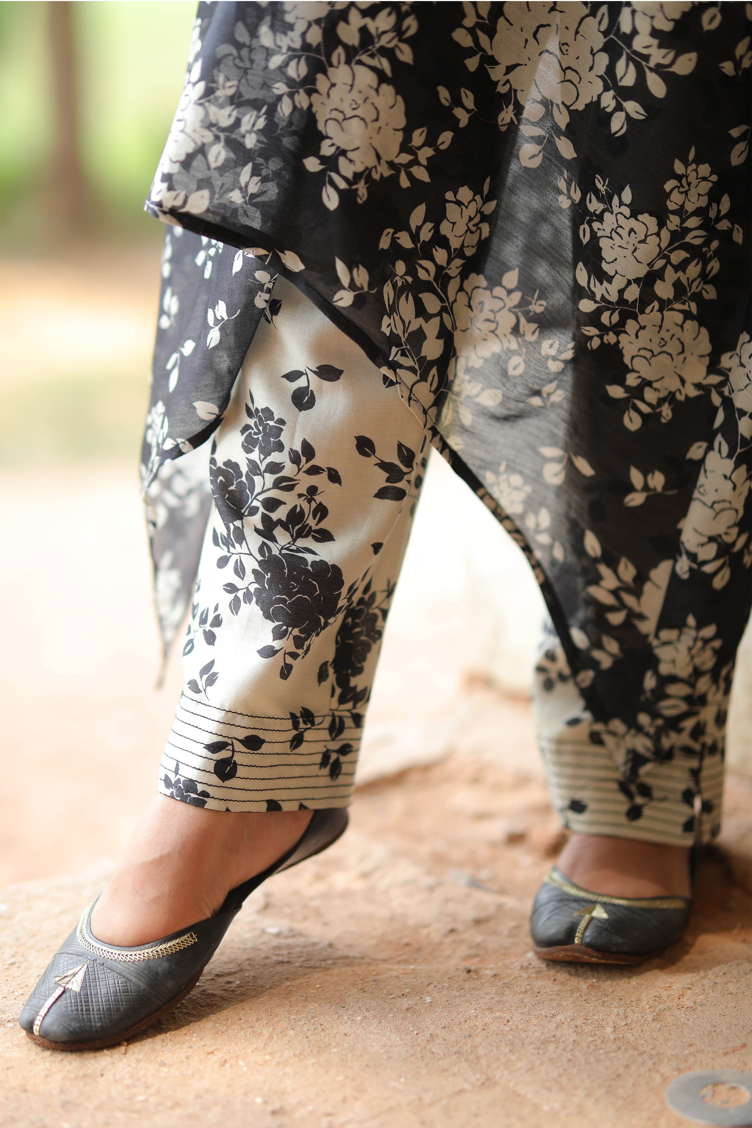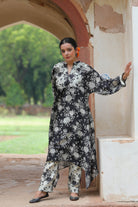 Una kurta anti-fit con estampado digital confeccionada en suave seda Chanderi. Se combina con pantalones estrechos y viene en un juego de 2.