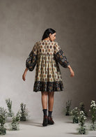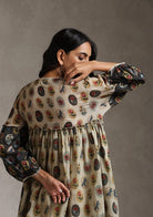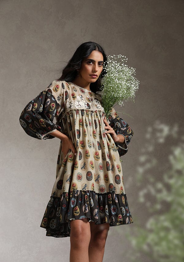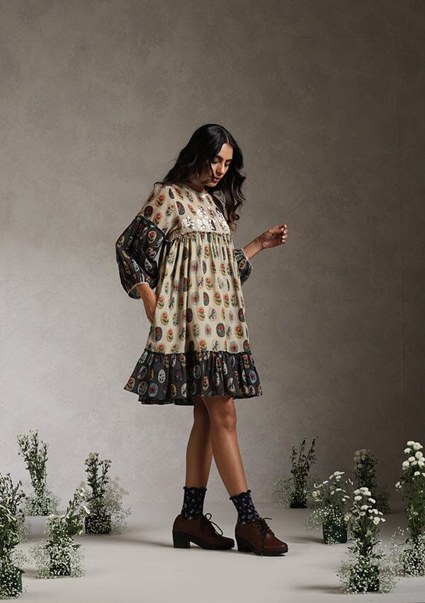 A short dress featuring hand embroidery on yoke. The dress is crafted out of cotton mul with hand painted floral artwork digitally placed all over. Delicate blanket stitches add to the cottage core style. The dress has has side pockets and it comes with a slip.