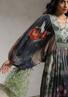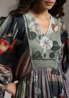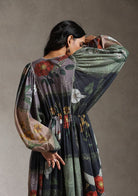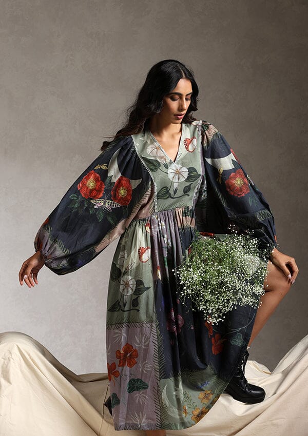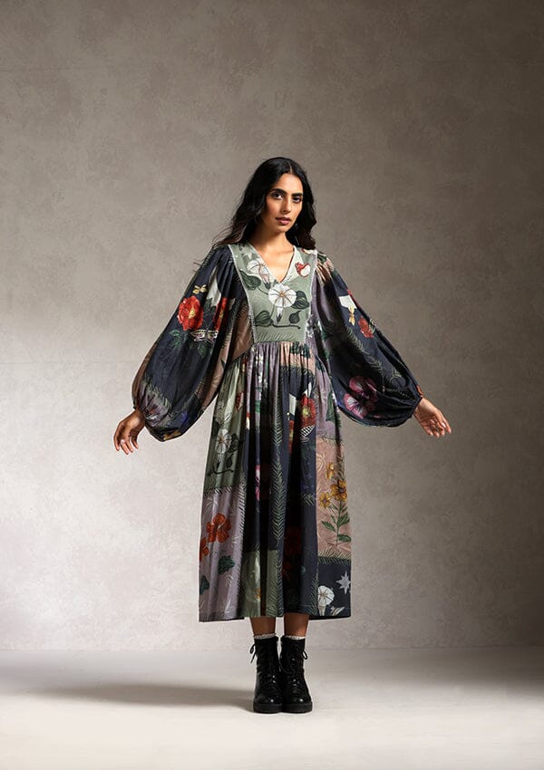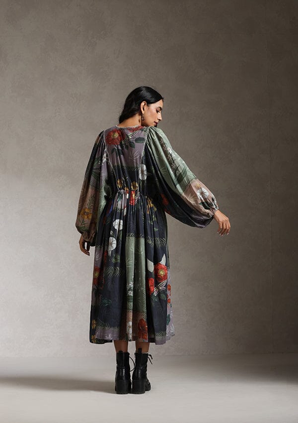 The dress is crafted out of cotton mul and comes in an anti-fit silhouette. It has an elasticated back waist that adds a feminine touch to the style and some extra comfort. The hand painted artworks are digitally placed all over the dress.