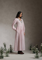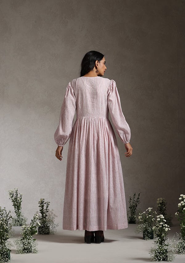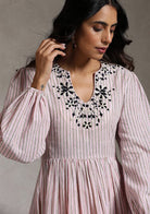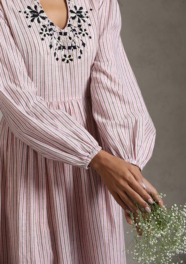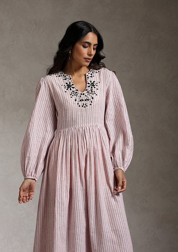 The Urban Bloom Dress features a romantic maxi silhouette crafted out of handloom cotton in striped pattern. Our signature hand embroidered motifs sit beautifully around the neckline.The dress has a comfortable rounded V- neckline, light gathering around the waist with side zipper and soft elasticated sleeve hem.