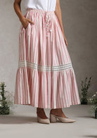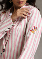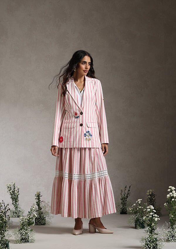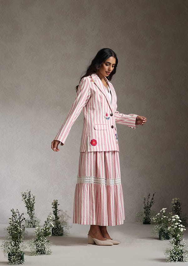 A tailored jacket crafted out of handloom striped cotton featuring hand embroidered motifs. The jacket has a soft yet a structured silhouette and it comes with flap pockets. This is paired with our Urban Bloom Skirt and comes as a set of 2.