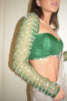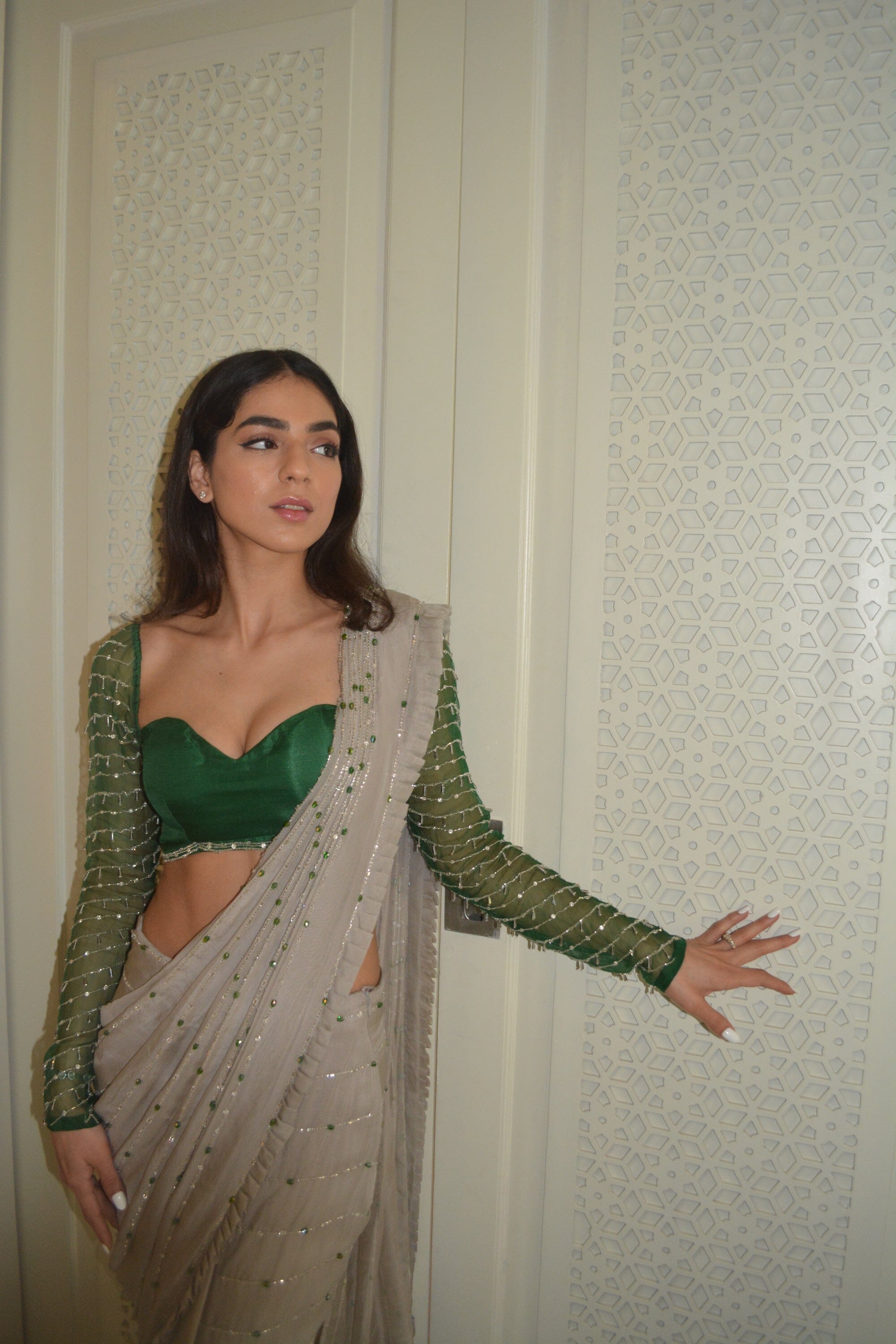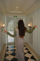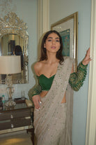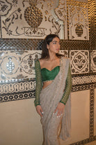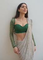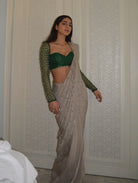 Este sari drapeado presenta un trabajo bordado a mano, además de una parte superior esculpida acolchada. Un tono verde Kelly contrasta con el tono nude de la prenda, creando una estética visual sorprendente.