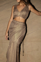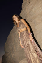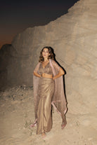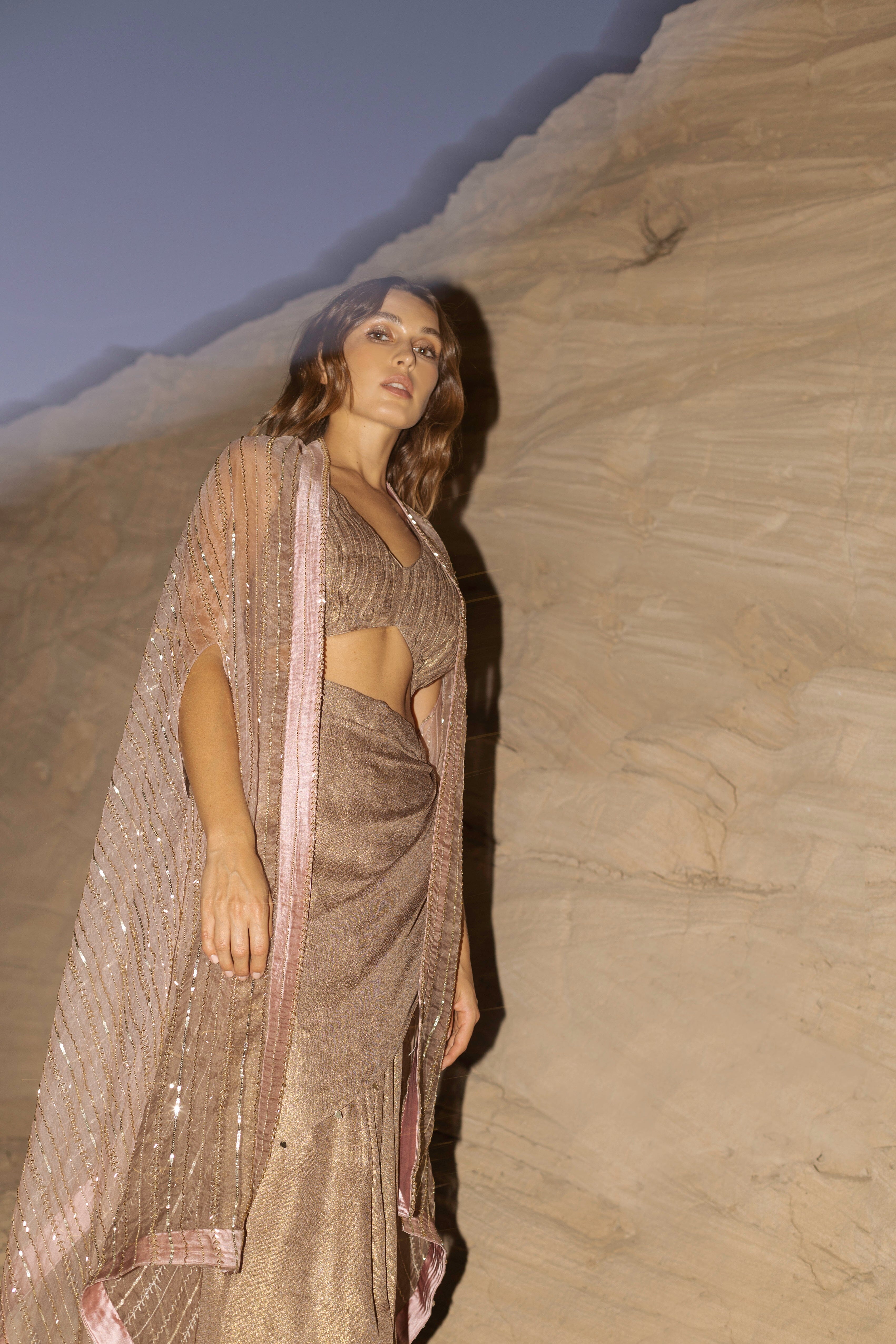 Una falda y un top esculpidos, combinados con una capa adornada teñida en un sutil ombré. Este elegante conjunto aportará elegancia a cualquier armario y será un complemento perfecto para cualquier ocasión especial.